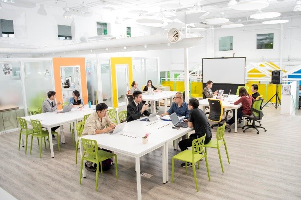 大廳懶骨頭休息區、零食不定期出沒茶水區、淋浴間、大型演講教室、中小型會議室、商洽區