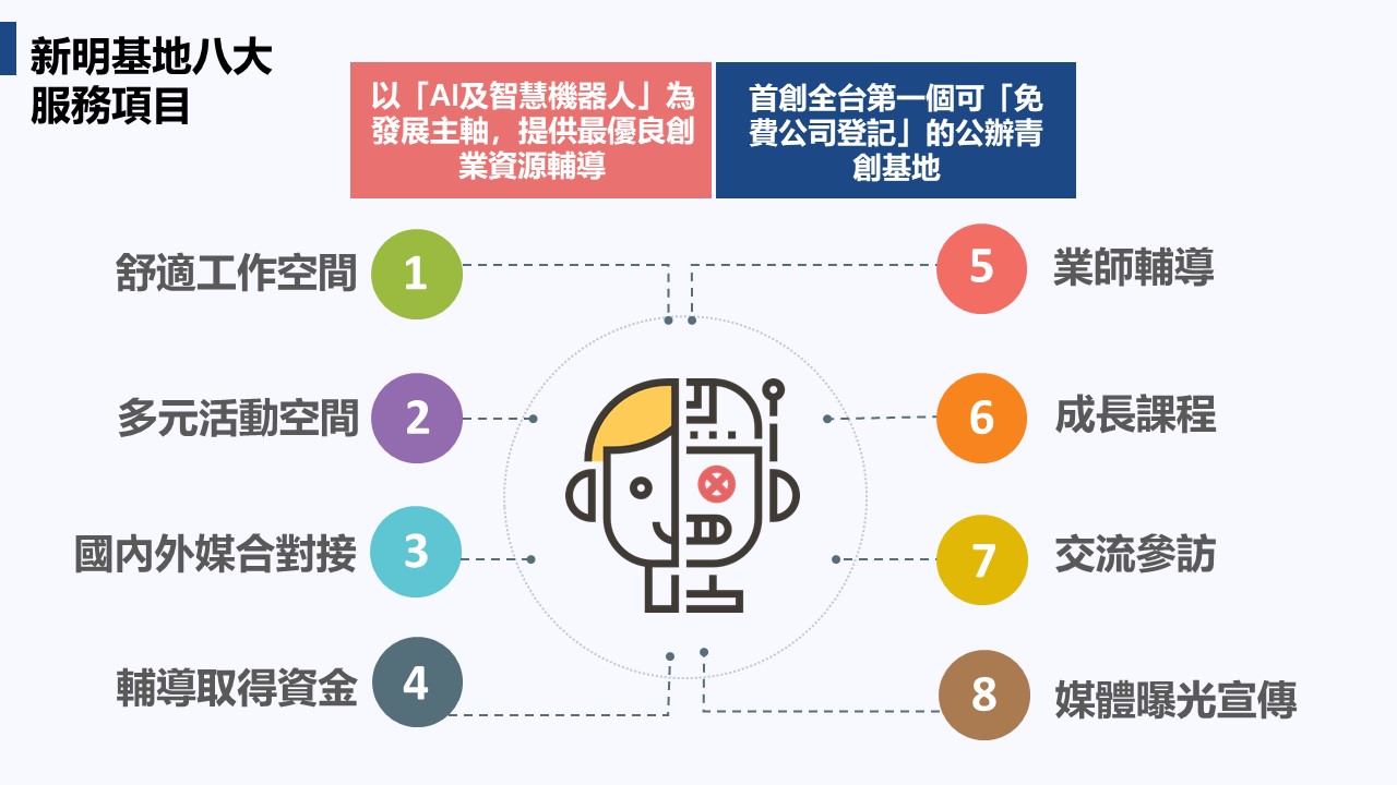 【新明青年創業基地】為桃園市政府青年事務局成立的第三個青創基地,也是第一個提供免費營業登記的公辦青年創業基地,本基地以『人工智慧及智慧機器人』為產業輔導重點,在這裡,我們不僅提供舒適輕鬆創業空間及各項創業輔導,更讓所有進駐團隊及會員聚集成一個產業聚落,給這裡的創業者們在省下每年數萬元借址登記費用時,也能夠在基地和其他創業者共同激盪創業的火花,有這樣優質的創業環境您還有理由閉門造車嗎?放下執念,和我們一起譜出未來的錢景吧!