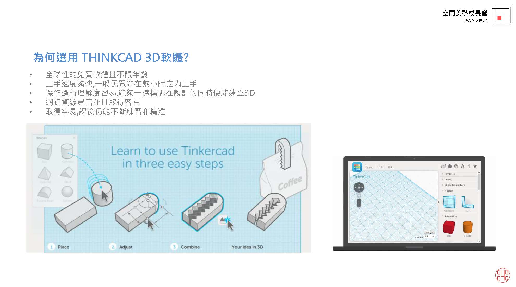 課程藉由可快捷並極好入手的THINKCAD,教導3D列印知識及觀念以及如何操作機器,並帶入主題式的目標教學和軟體的操作及繪製,讓學員能直接繪製出一定程度的作品,了解流程後裡用數控機器,進行輸出自造,並藉由基本的機電達成作品的機能和成就感。