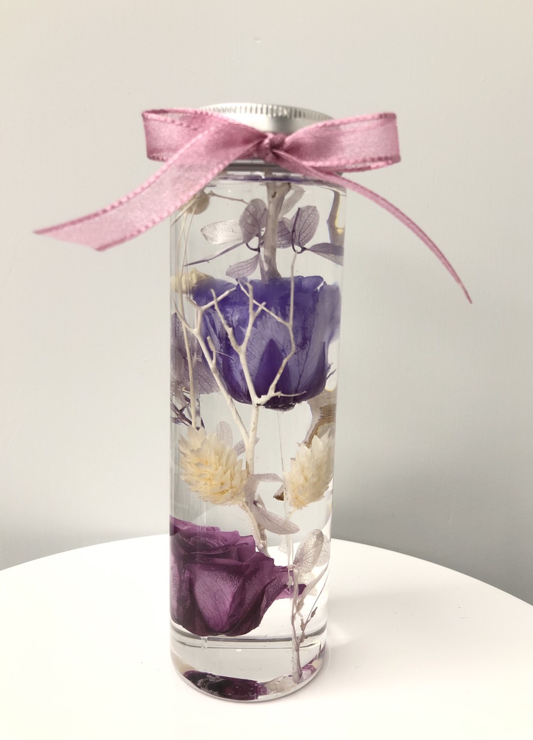 - 材料內容: 繡球花/玫瑰花/臨花/白樹枝/加那利/塑膠透明棒/玻璃瓶/緞帶/礦物油