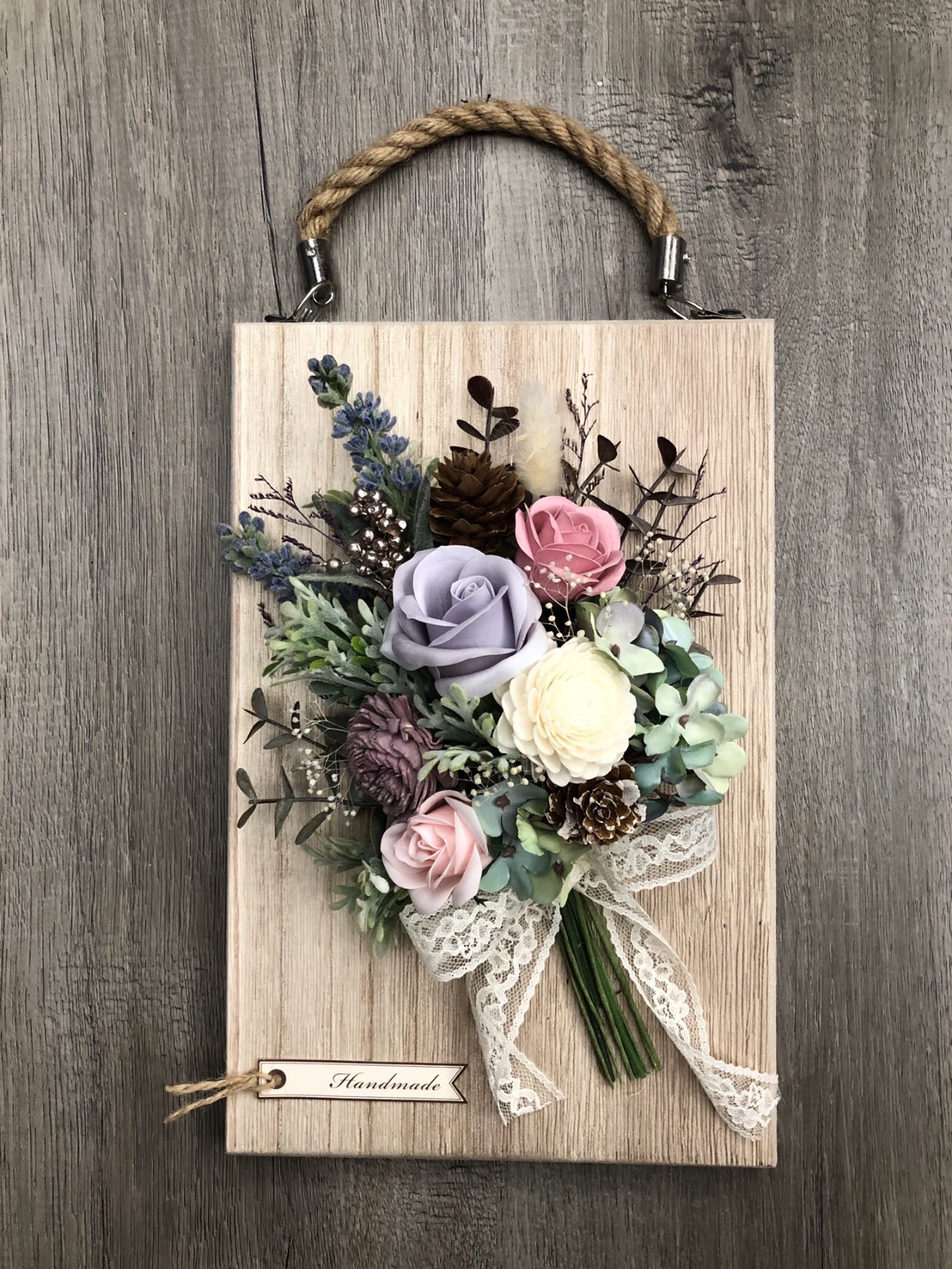 - 材料內容: 香氛玫瑰/太陽玫瑰/木滿天星/松果/卡斯比亞/仿真繍球花/薰衣草/尤加利葉/蕾絲帶 /原木