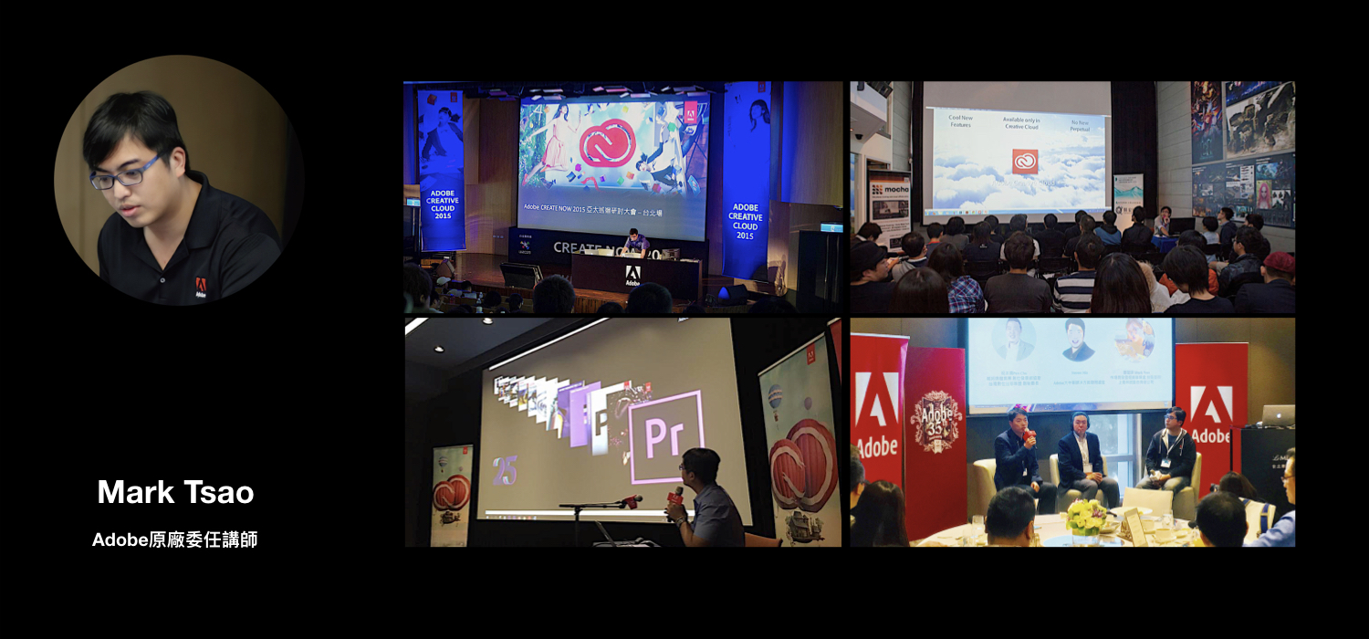 曹聖庚(Mark),現為台灣 Adobe 代理商技術支援暨教育推廣講師,擅長 Adobe 全系列產品新功能演示與雲端工作流程整合,2014迄今五年近千場教育訓練經驗,目前委訓於各大專院校、政府單位與民間企業多媒體教育導入推廣。