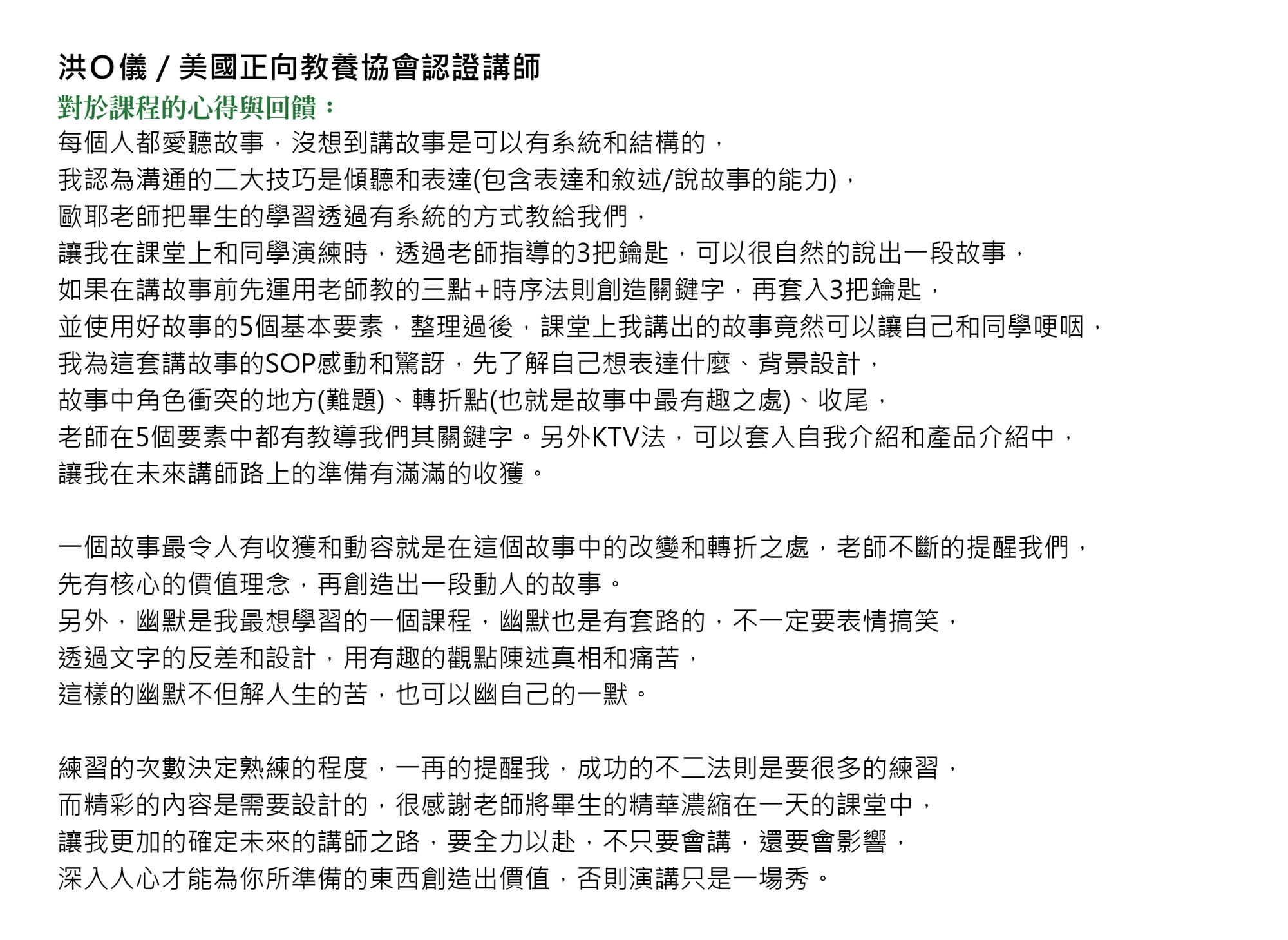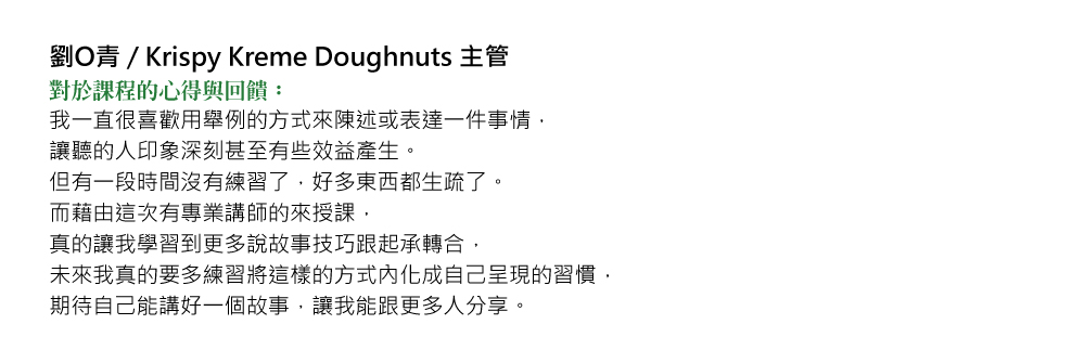 「當年被迫參加公司的一堂課,聽到您的故事讓我學會了原諒他人與自己,謝謝...」