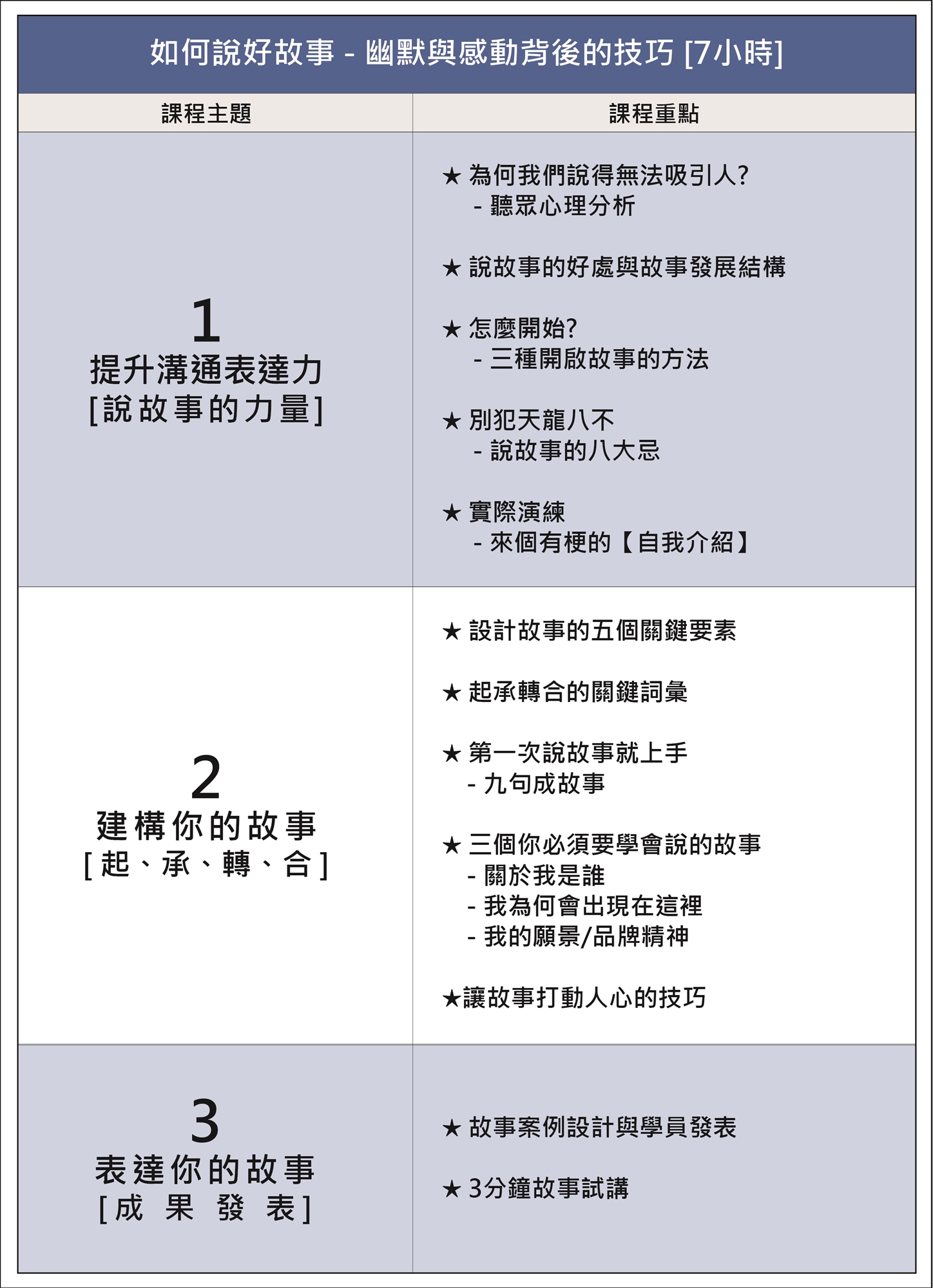 讓學員學會故事設計與故事表達的技巧,說話更加動聽有魅力。
