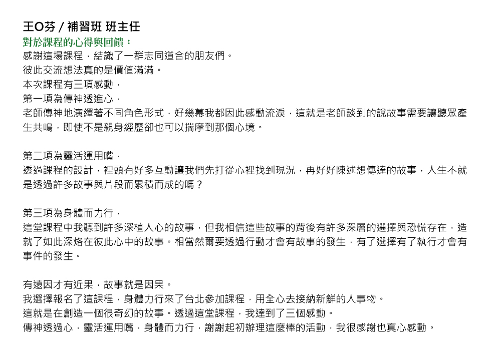 有一天,這位會說故事並兼具編導演身份的老師,收到了來自學員、觀眾的感謝。