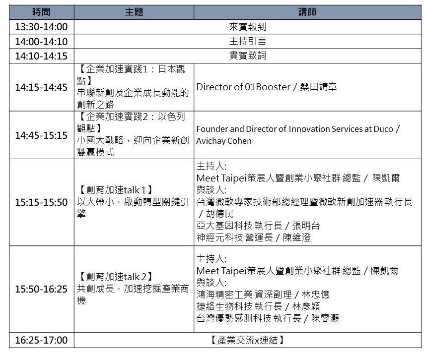 本次論壇中邀請到國際企業加速器重量級代表進行案例分享、台灣企業代表與新創嘉賓進行案例對談,期望打破台灣既有的創新框架,借鏡他人的分享,加速產業的成長。