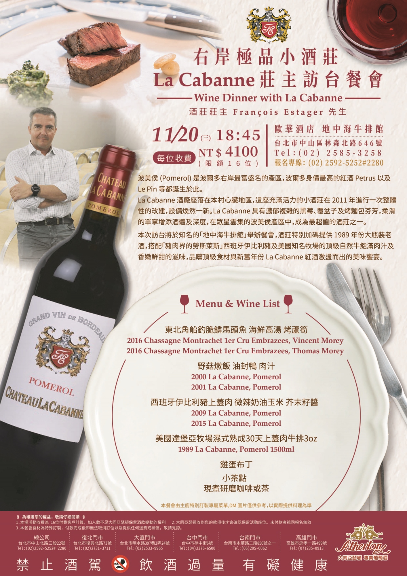 本次訪台將於知名的「地中海牛排館」舉辦餐會,酒莊特別加碼提供 1989 年份大瓶裝老酒,搭配「豬肉界的勞斯萊斯」西班牙伊比利豬及美國知名牧場的頂級自然牛飽滿肉汁及香嫩鮮甜的滋味,品嚐頂級食材與新舊年份 La Cabanne 紅酒激盪而出的美味饗宴。