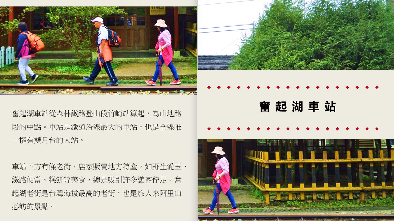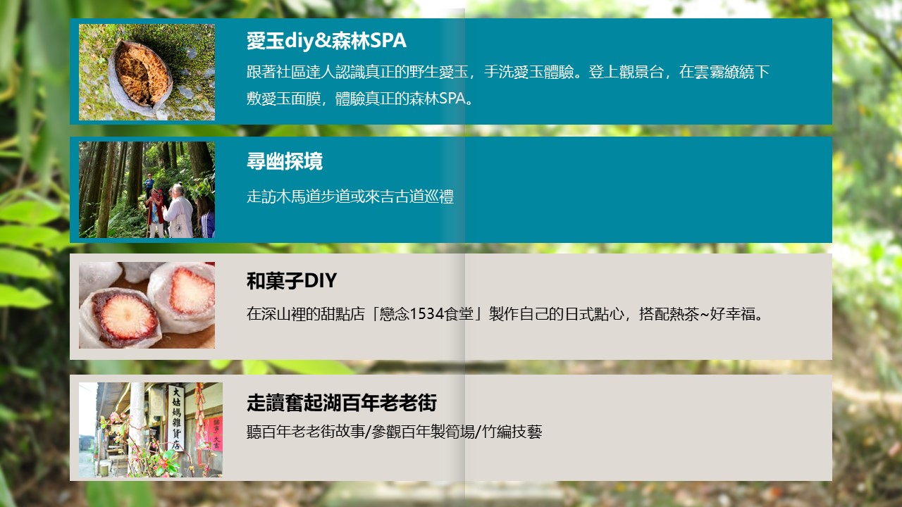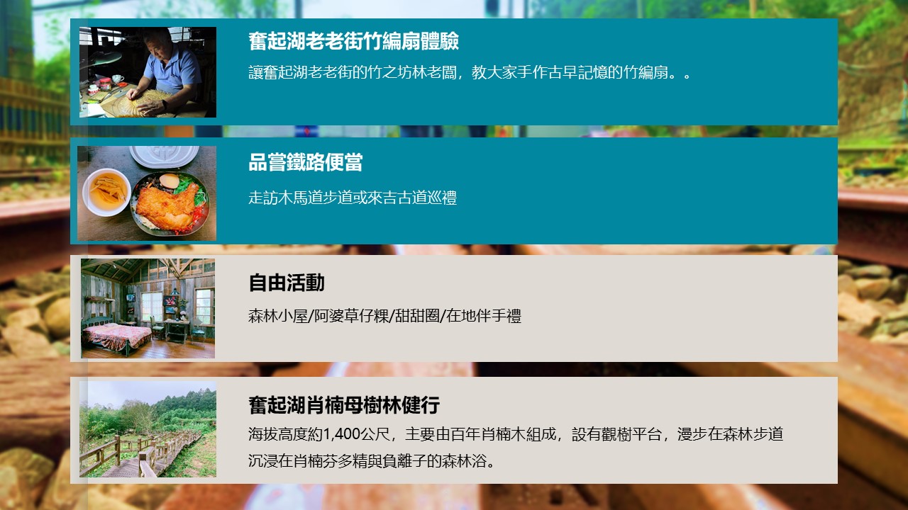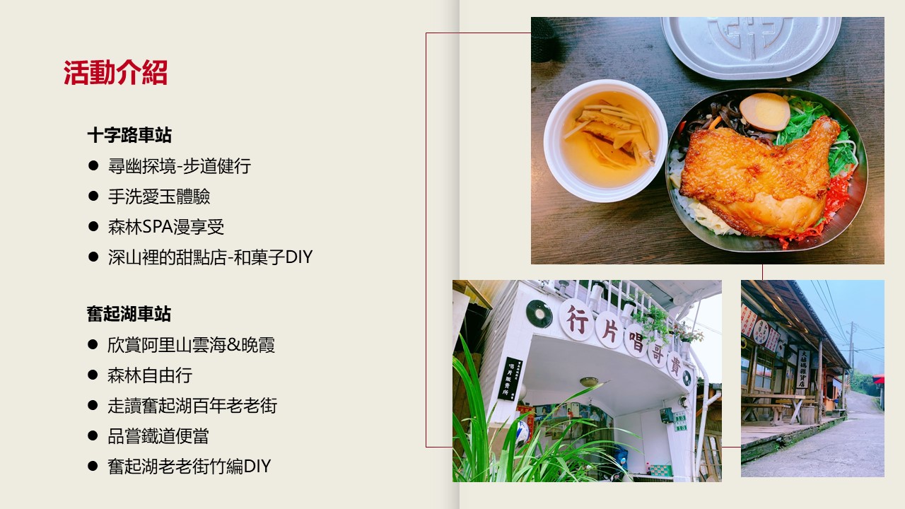 活動:步道健行、和菓子DIY、森林自由行、走讀奮起湖百年老老街、品嘗鐵路便當、竹編DIY