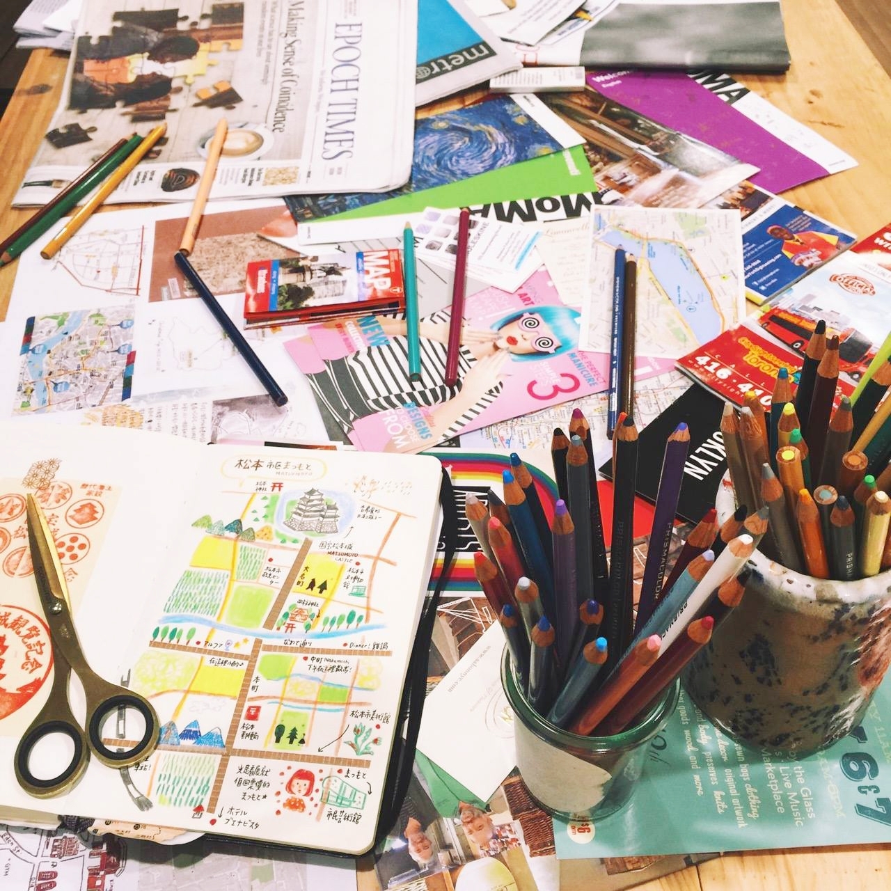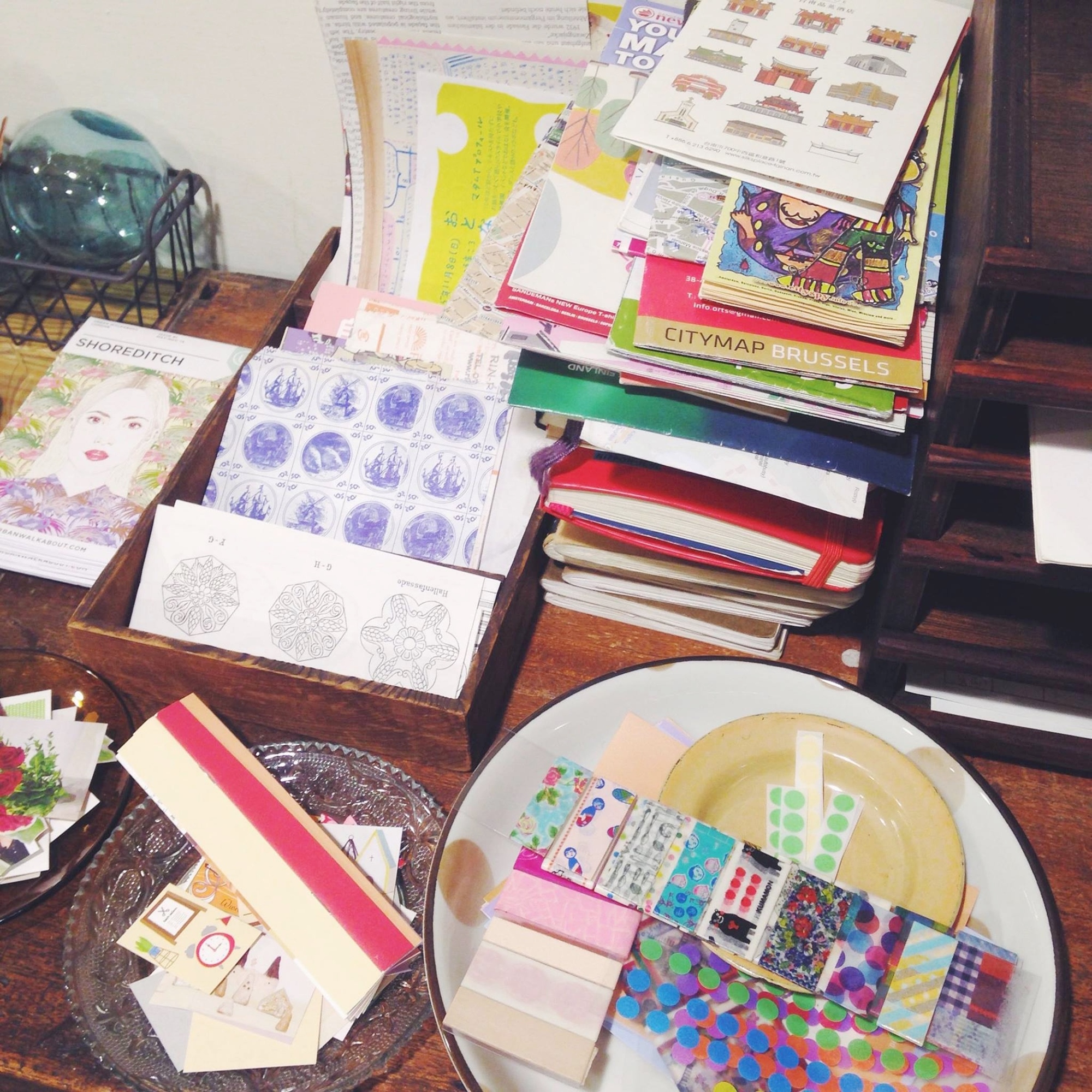 把名片、廣告傳單、貼紙、票根、地圖等文宣品,結合曾經去過的咖啡廳、餐廳、小旅行,或是想去的目的地,作為靈感發想。