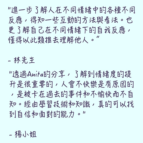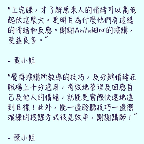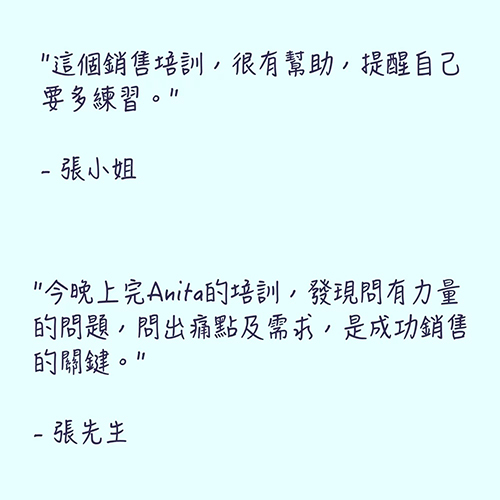 ➲ Anita企業教練,累積一對一諮商輔導超過數千小時,熱衷於知識培訓、人才養成、教練人們輕鬆運用所學、享受學習的樂趣,並進一步優化生活、工作與企業管理,已經協助超過千人,完成目標實現夢想。