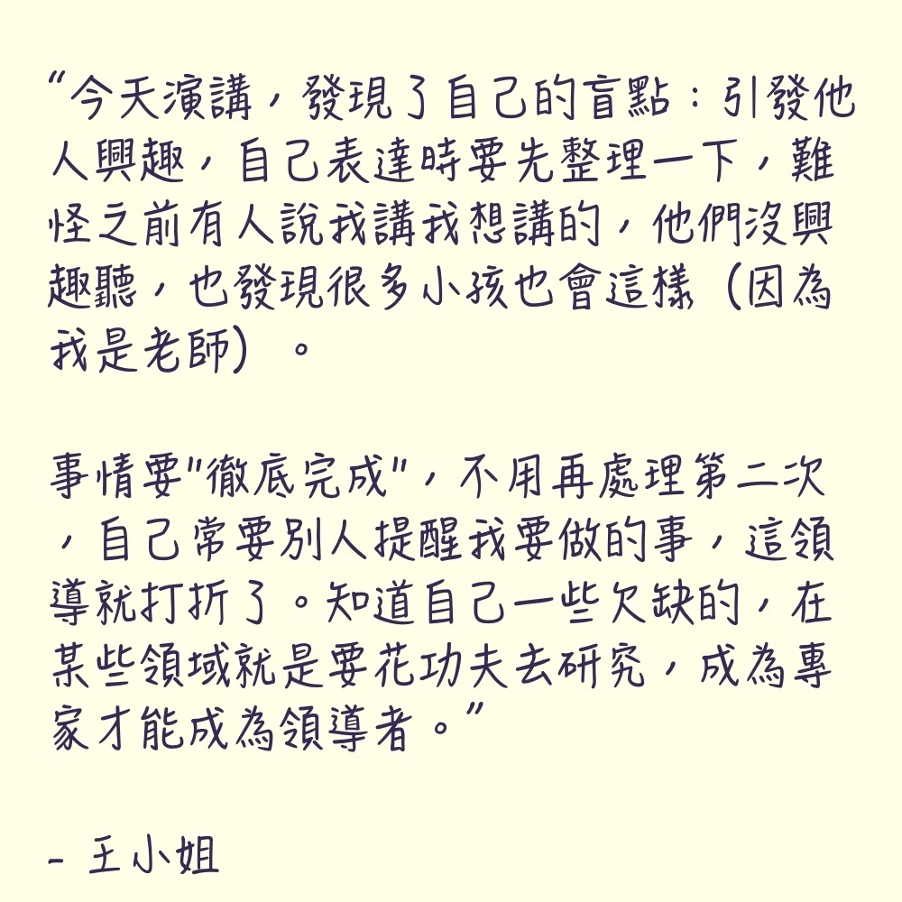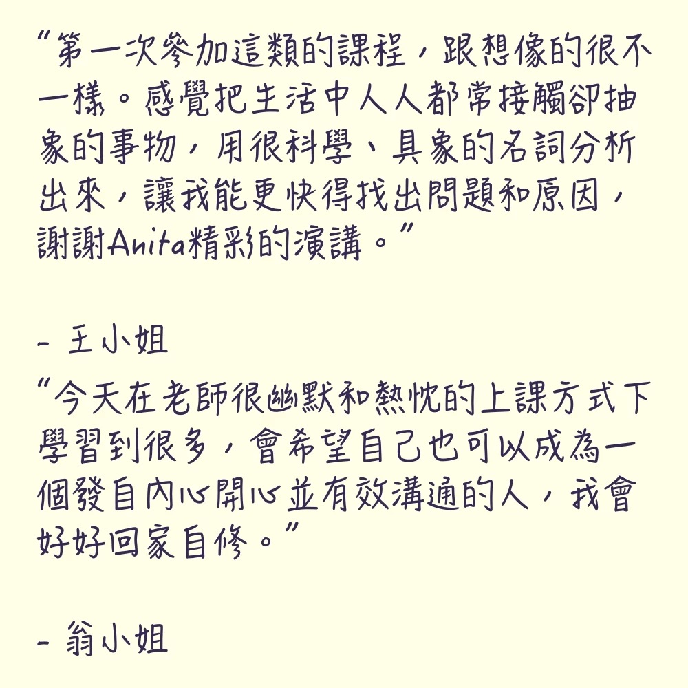➲ Anita企業教練,累積一對一諮商輔導超過數千小時,熱衷於知識培訓、人才養成、教練人們輕鬆運用所學、享受學習的樂趣,並進一步優化生活、工作與企業管理,已經協助超過千人,完成目標實現夢想。