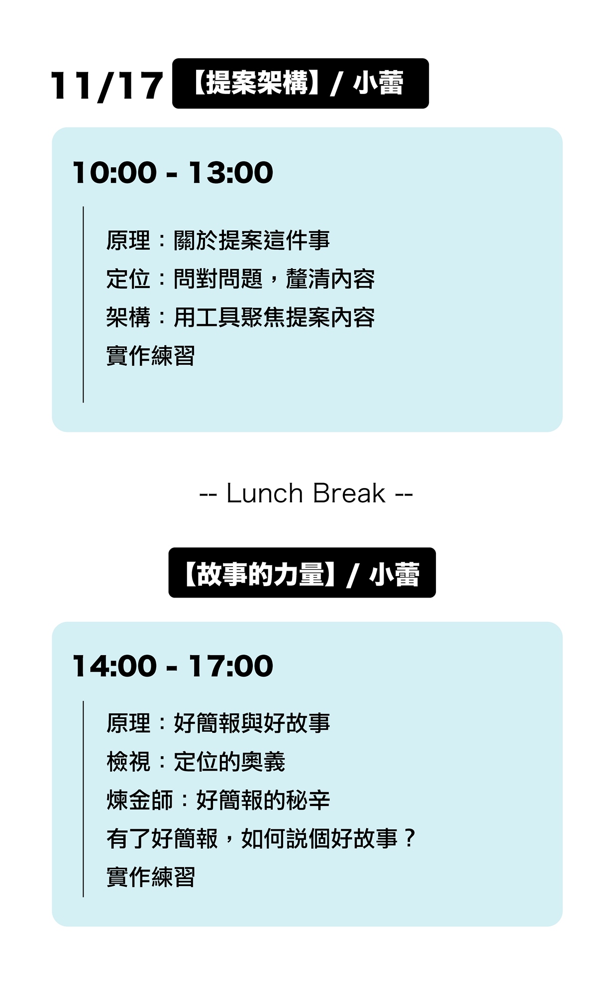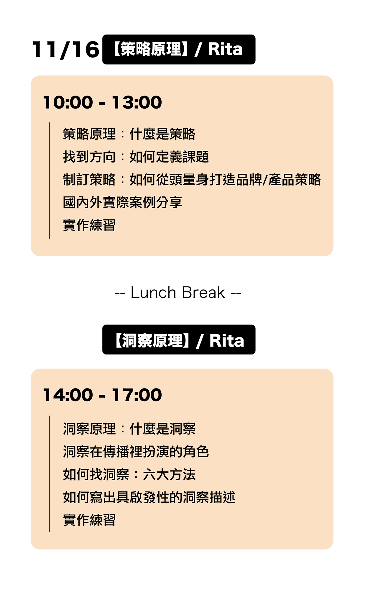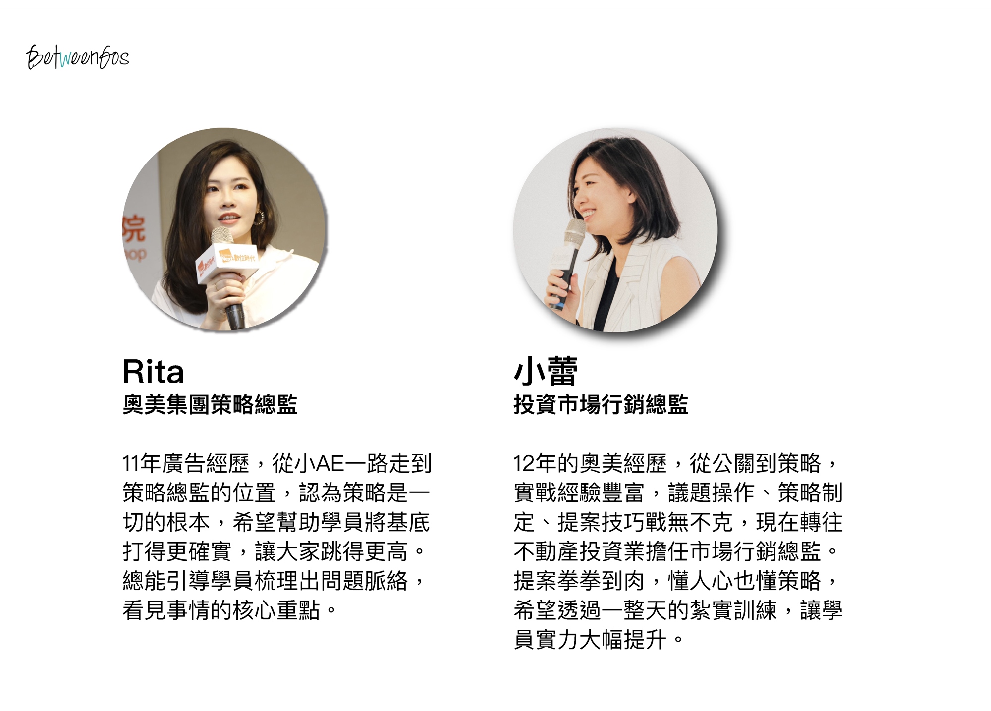 本次工作坊一共兩天,第一天由奧美策略總監Rita,傳授坊間企業少有的策略思考、實作訓練;第二天從策略延伸,針對內容架構、簡報/提案技巧,用實地演練、分組上台報告的方式,帶你突破工作瓶頸,行銷即戰力大躍進,開啟職涯和薪資的更多可能性。