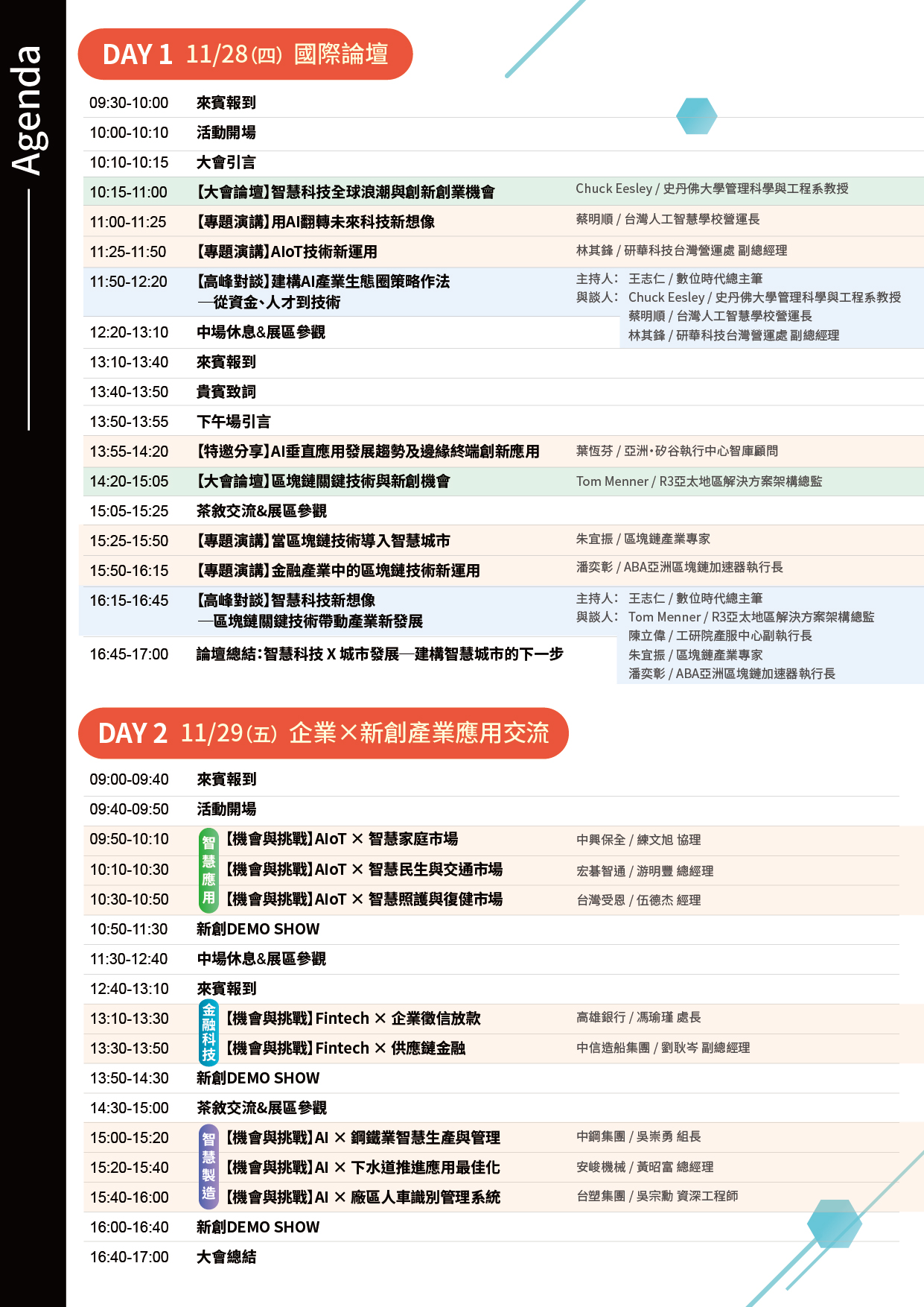 台灣人工智慧學校營運長蔡明順、區塊鏈產業專家朱宜振,研華科技台灣營運處副總經理林其鋒,ABA亞洲區塊鏈加速器執行長潘奕彰及相關新創公司分享新技術運用,與國際講師的對談與激盪更是不可錯過!現場更有新創團隊新商品與新商模的展示,一窺產業應用佈局。