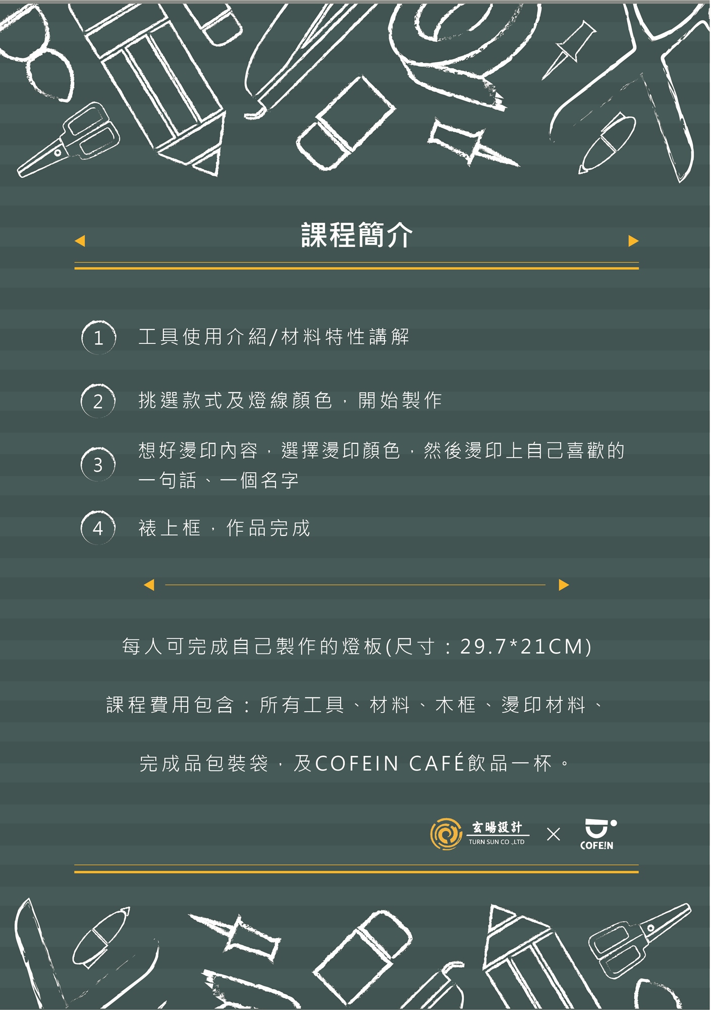 ●課程費用包含:所有工具、材料、木框、燙印材料、完成品包裝袋,及COFEIN CAFÉ飲品一杯。
