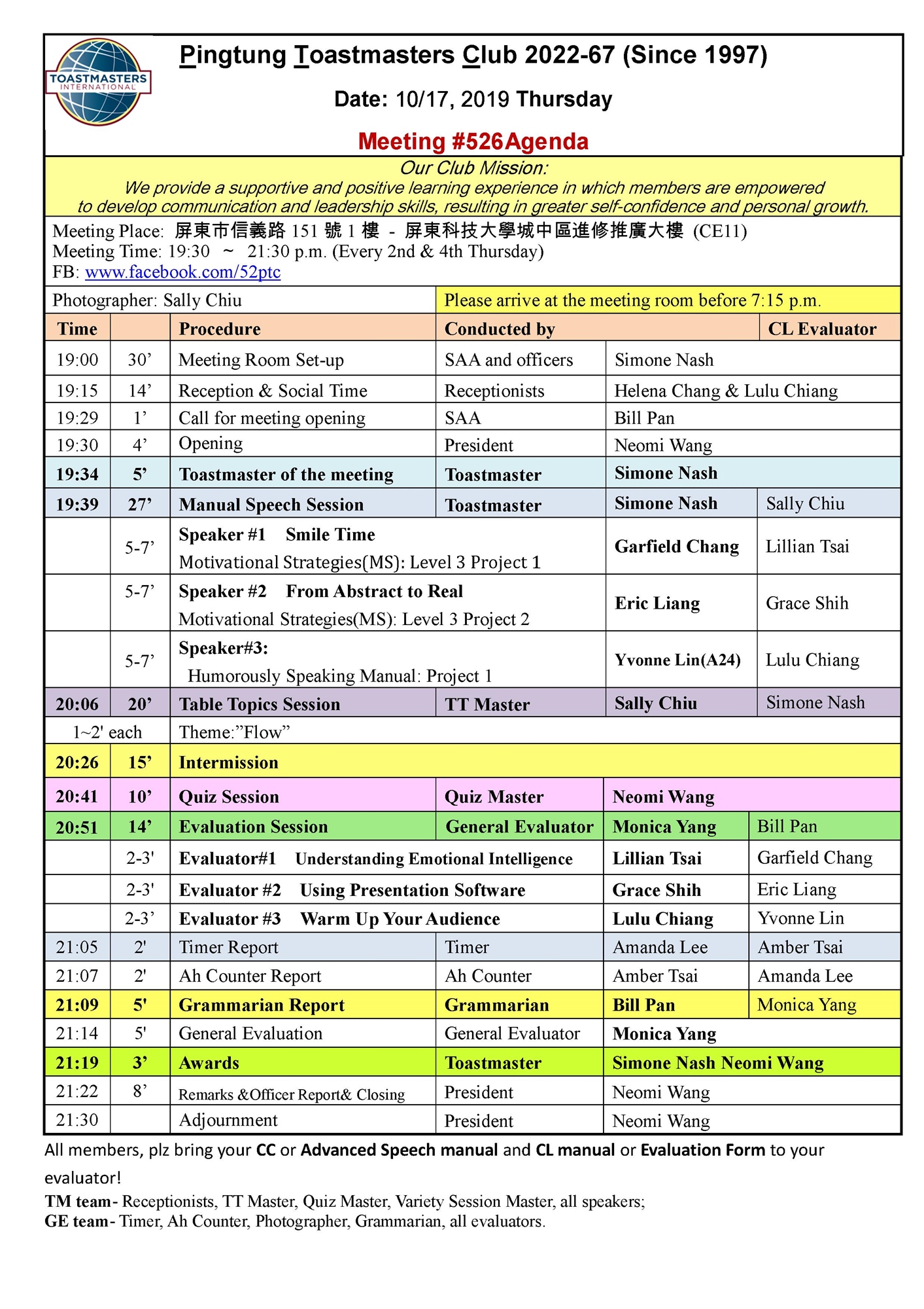 Welcome to our official meeting of PTC (Pingtung Toastmasters Club)