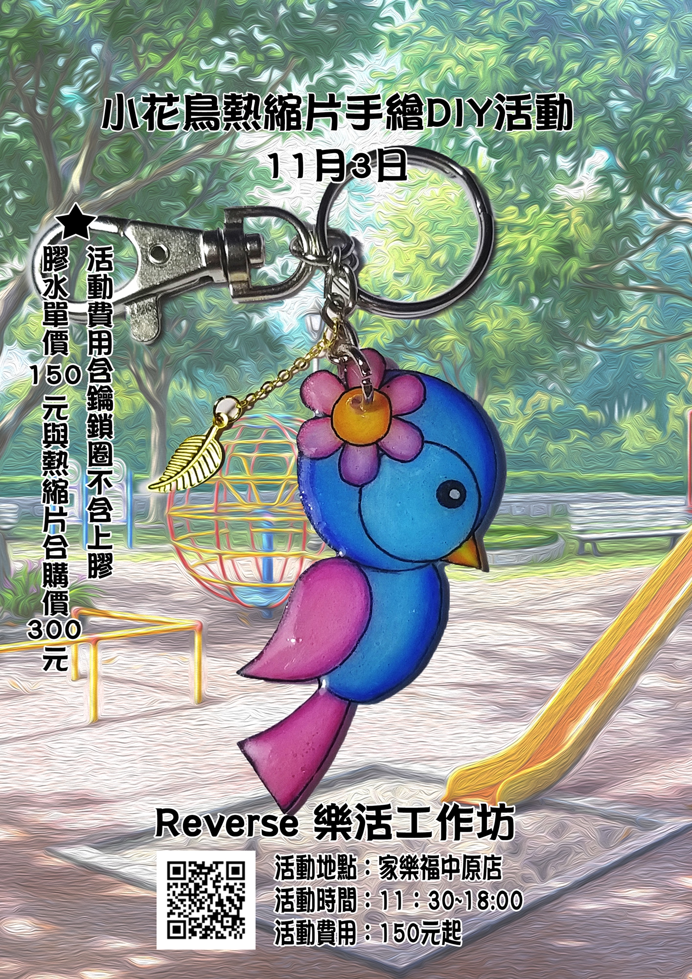 活動主題為小花鳥手繪熱縮片活動,本活動將會教大家如何製作美美的作品,而您若想保護作品則建議加購UV膠水