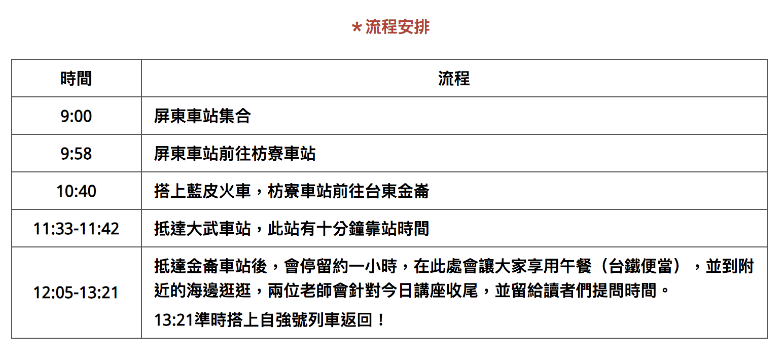 9:00屏東車站集合 —— 10:40屏東枋寮藍皮出發 —— 12:05抵達台東金崙