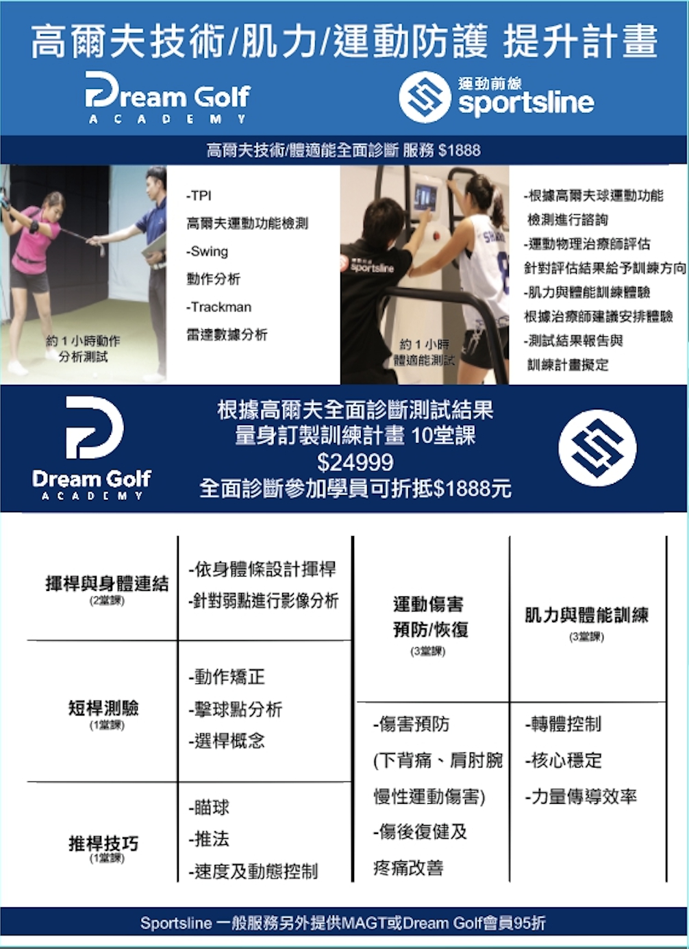 而我們已正式與社會業餘高爾夫巡迴賽(Mid Amateur Golf Tour, MAGT)以及Dream Golf Academy,兩個高爾夫業界巨擘合作,如有高球訓練相關問題,歡迎聯絡我們!
