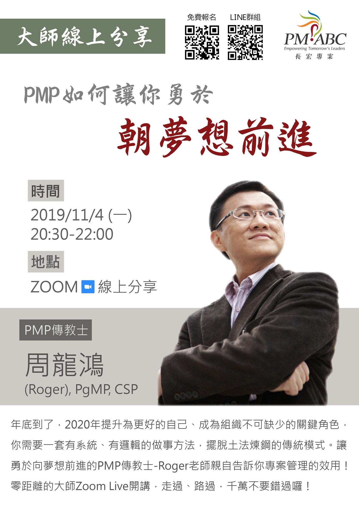 <免費充電課程> 11/4(一) 晚上8:30 勇於向夢想前進:PMP傳教士@Zoom分享: PMP對我的影響及改變