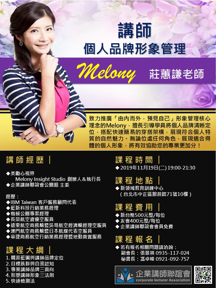 【企業講師聯誼會 11月19日(二) 19:00-21:30 莊蕙謙老師:講師個人品牌形象管理】