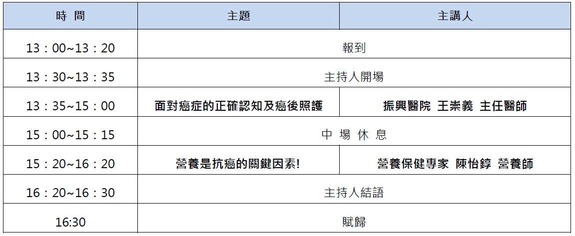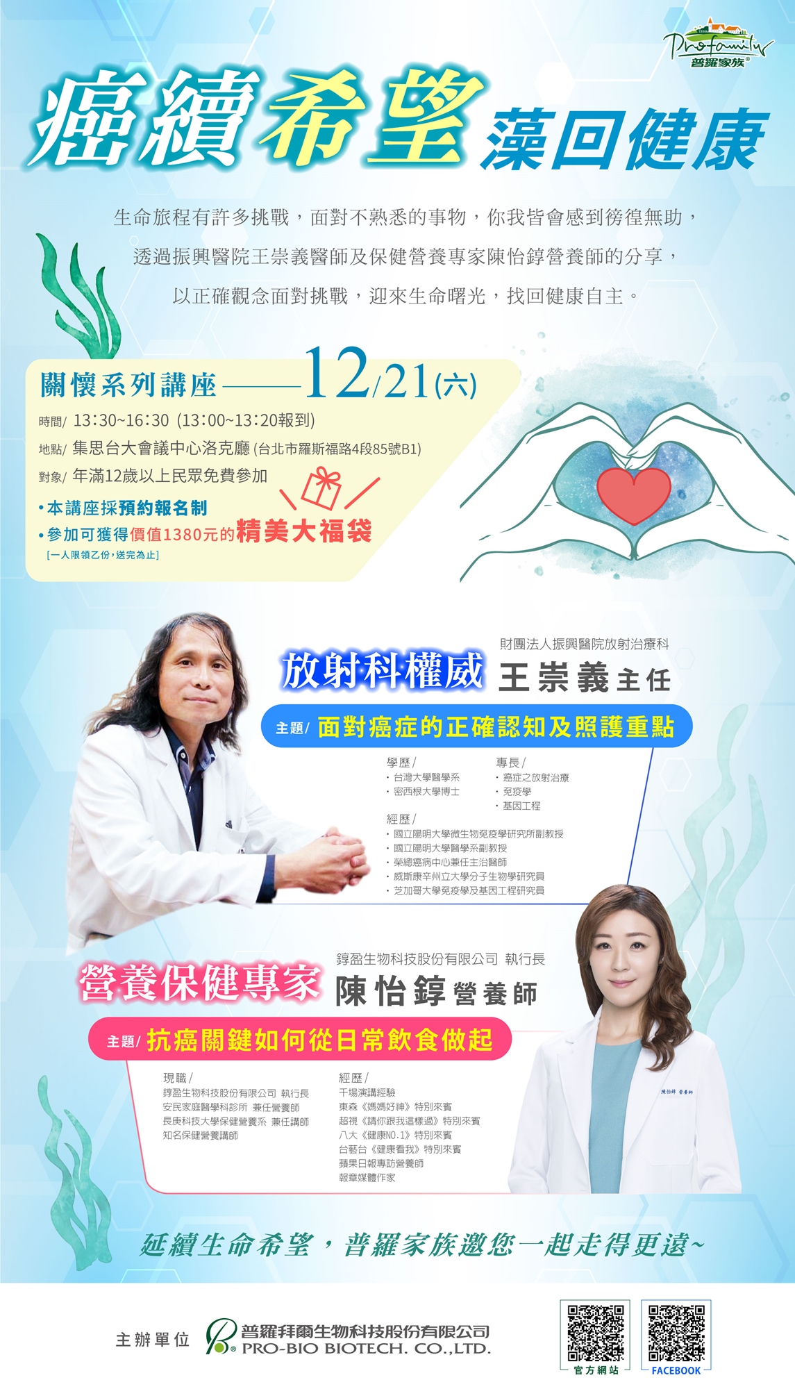 今年十二月,普羅家族邀請到振興醫院放射治療科主任-王崇義醫師,分享面對癌症的正確認知及照護重點。知名保健營養講師Donna-陳怡錞營養師,教大家抗癌關鍵如何從日常飲食做起。