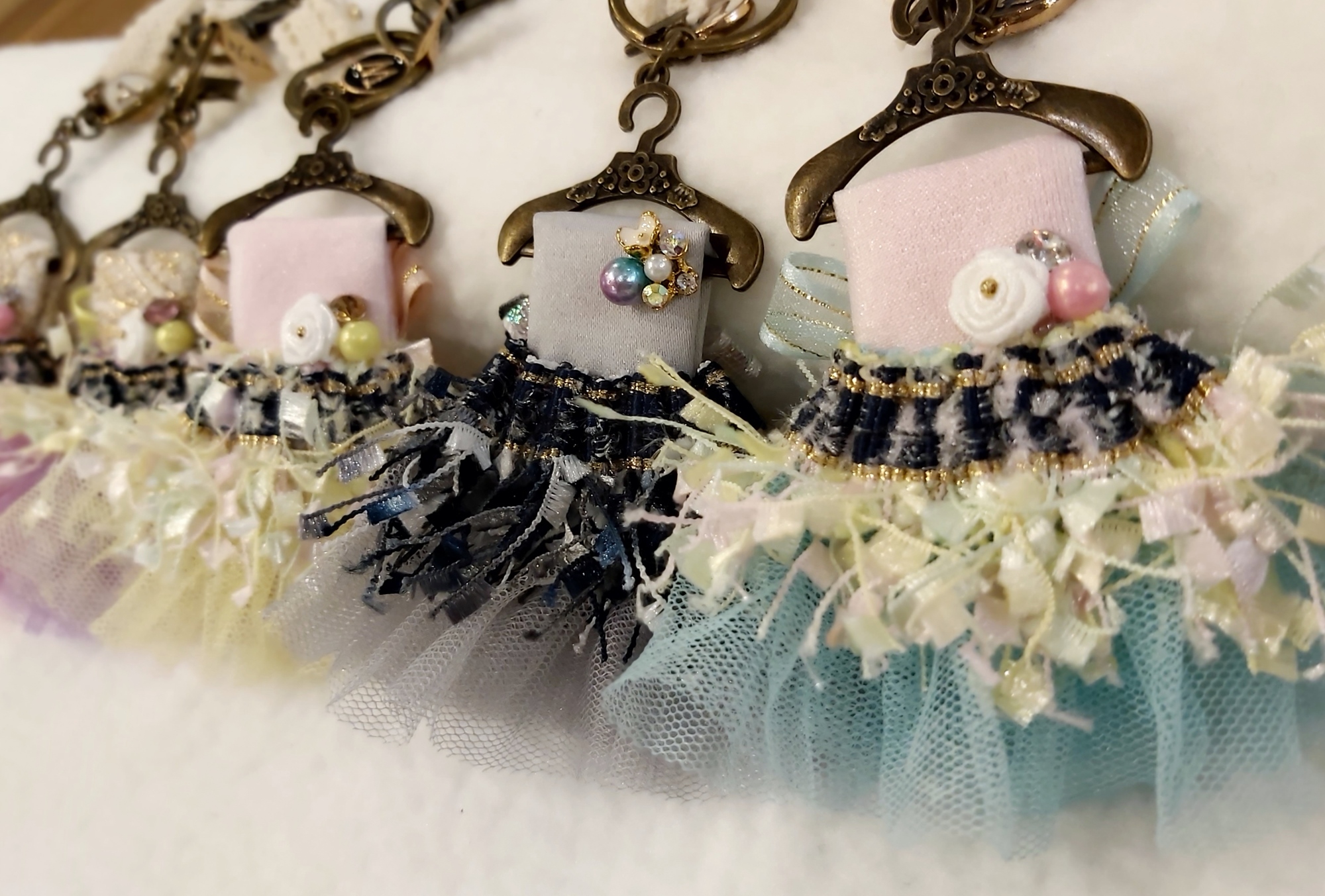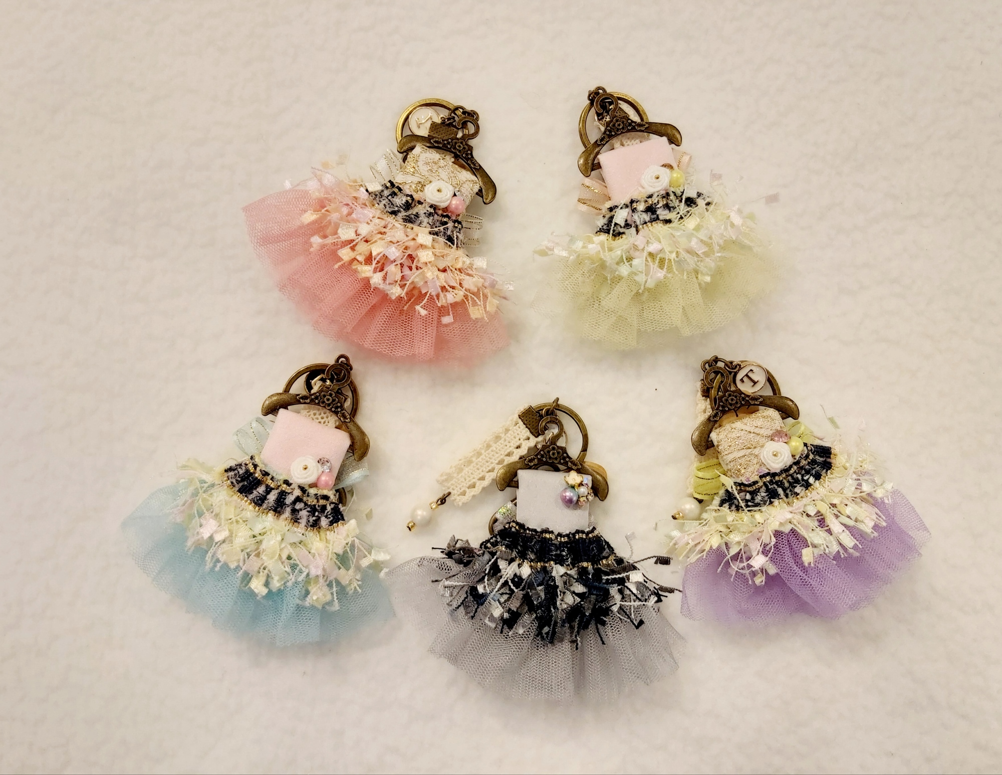 利用蕾絲做成澎澎裙小禮服,套上小衣架,再搭配鑰匙圈和其他配件;可以很簡單又快速的完成漂亮、實用的鑰匙圈吊飾!