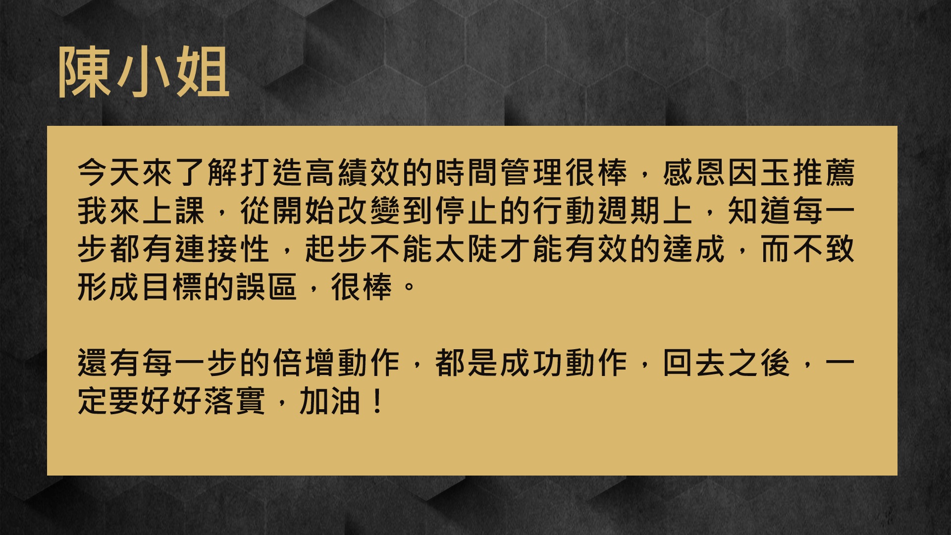 本次課程特別邀請英國University of Bradford行銷碩士,同時也是Joy to know 就去學的執行長Anita,帶大家深入了解浪費時間、沒有效率的根本原因,杜絕沒有效率的做法並且學會如何控制混亂,快速完成每項工作,大幅提升工作效率!