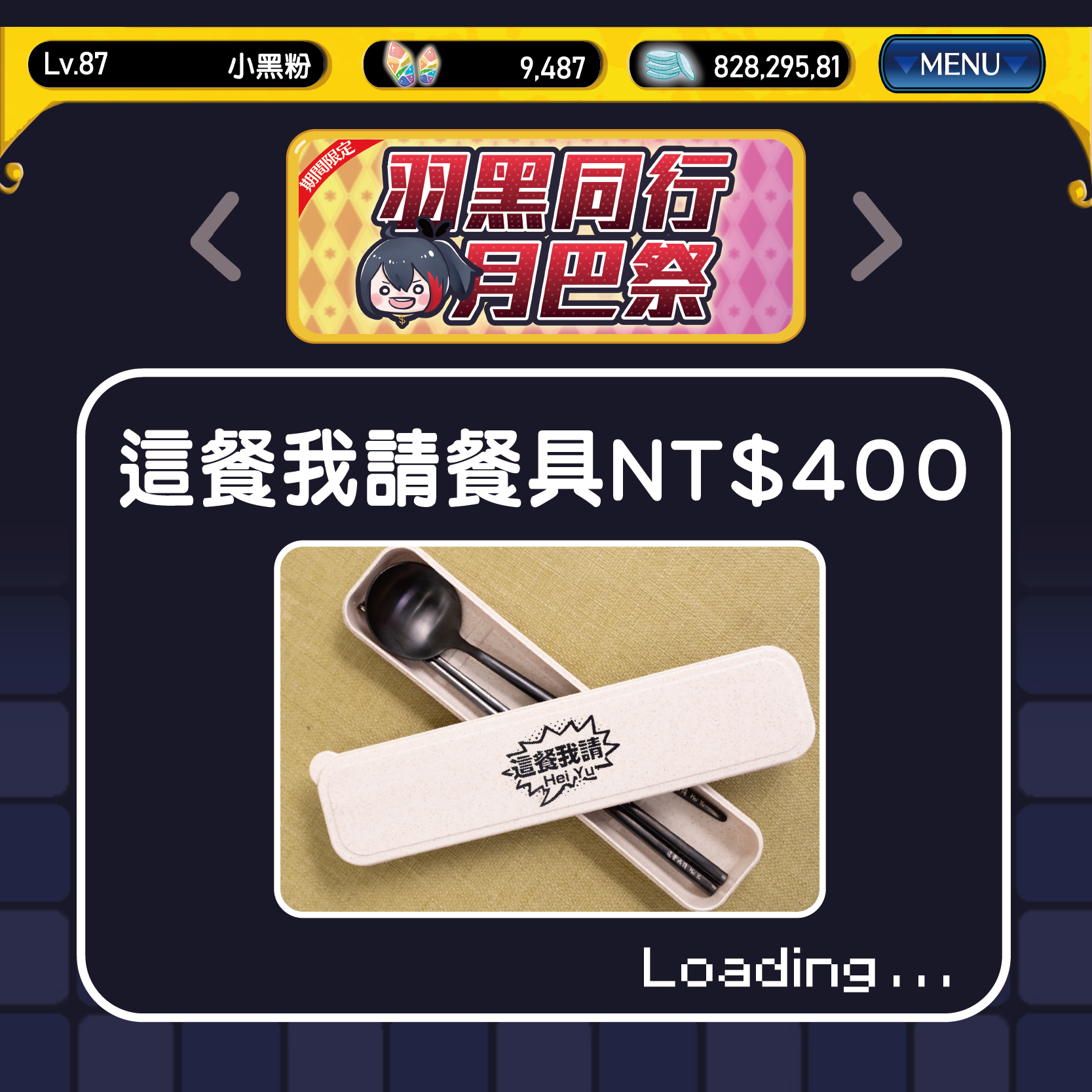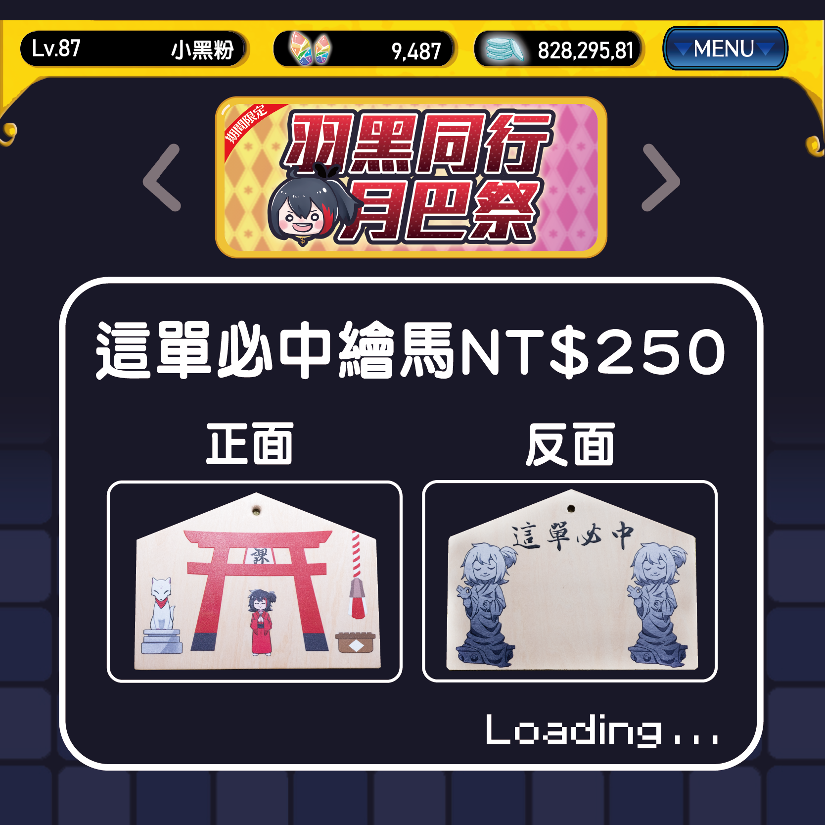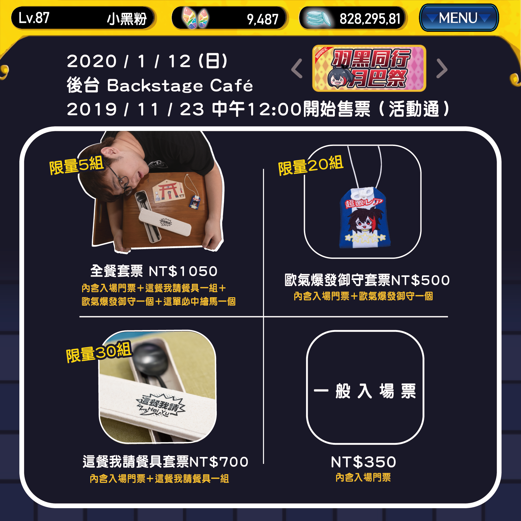 - NT$1050 全餐套票(內含一般入場票、一個御守、一組餐具、一個繪馬及另外送黑羽簽名拍立得一張)(限量優惠5組)