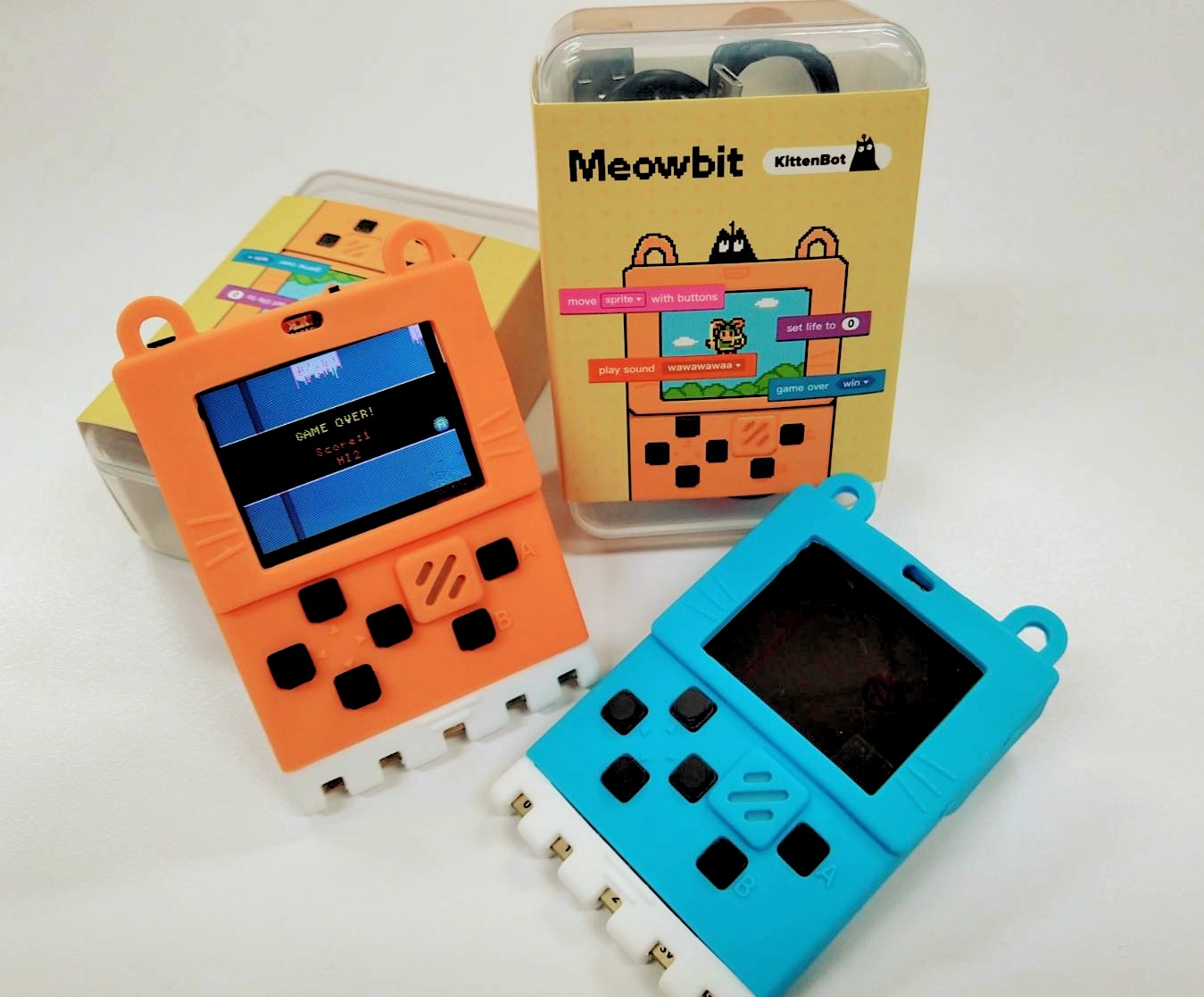 課程所用器材「Meowbit」,Meowbit是款兼容Microbit,且具有1.8吋螢幕,程式按鍵及感應器等,麻雀雖小五臟俱全,不只是物聯網入門的優質教材,也適合作為程式學習的玩具。
