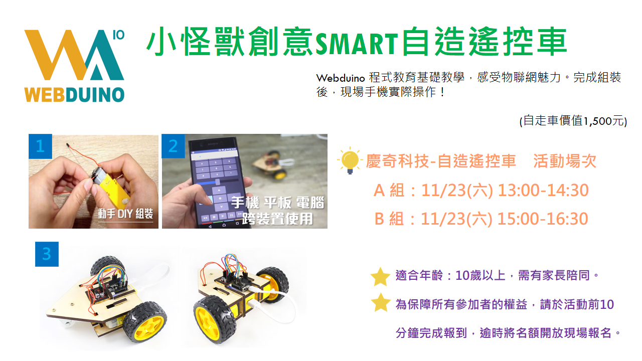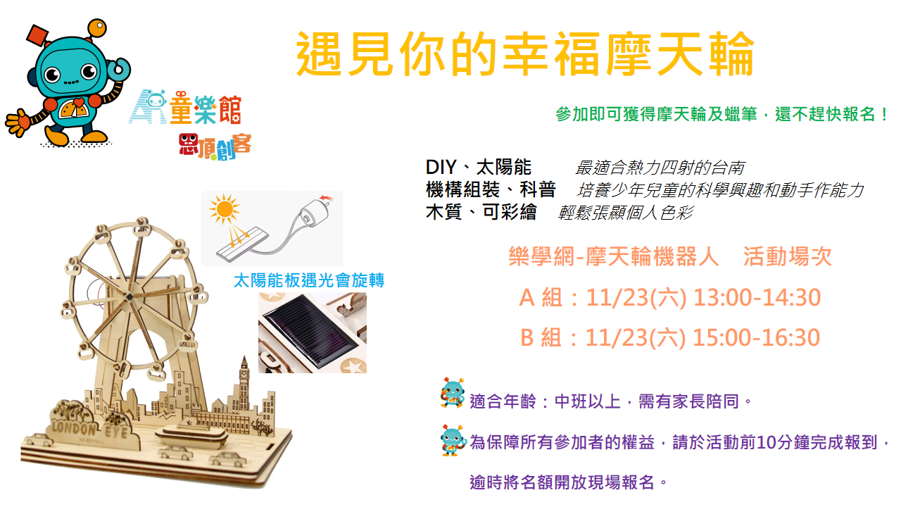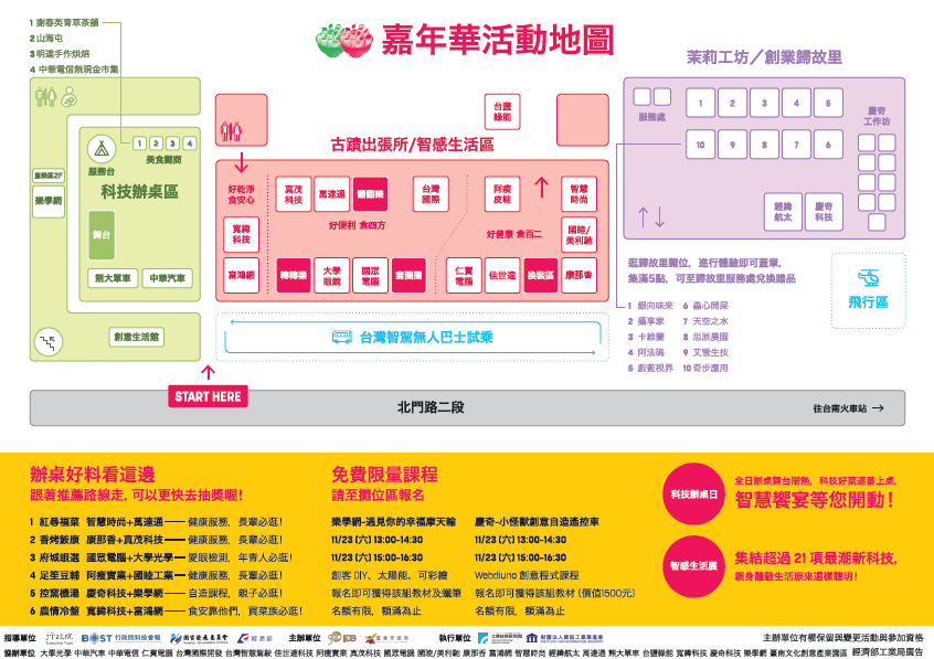 高級智慧教具免費玩🔸無人車免費試乘🔸凱比機器人帶動唱🔸Maker自製遙控車🔸手機大獎現場抽🔸神農機升空展示🔸男女握力比試擂台🔸AR幫你配眼鏡🔸扁平足救星🔸長輩防走失定位神器🔸防久坐智慧輪椅🔸農漁食安守門員出動🔸台南好食好味伴手禮🔸講不完的新科技,你來你就知!
