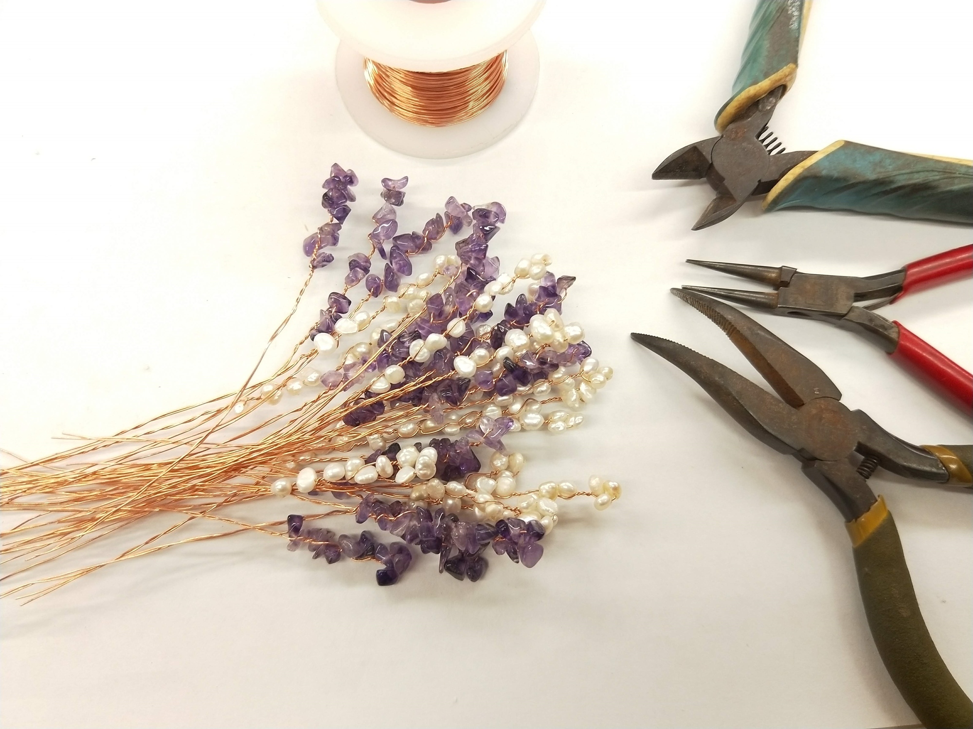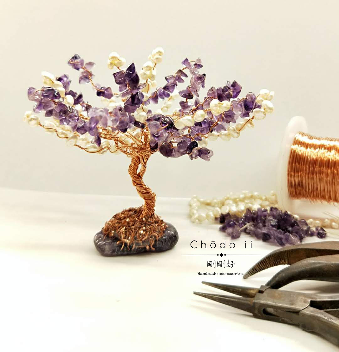 課堂中會教學員運用金屬線製作花樹樹幹,上頭樹葉是採用天然紫水晶,及天然珍珠。