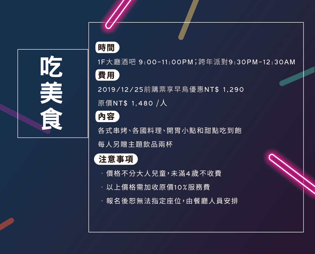 搭配香甜繽紛的甜點、飲品無限饗用,大快朵頤享受美味就在這一刻!