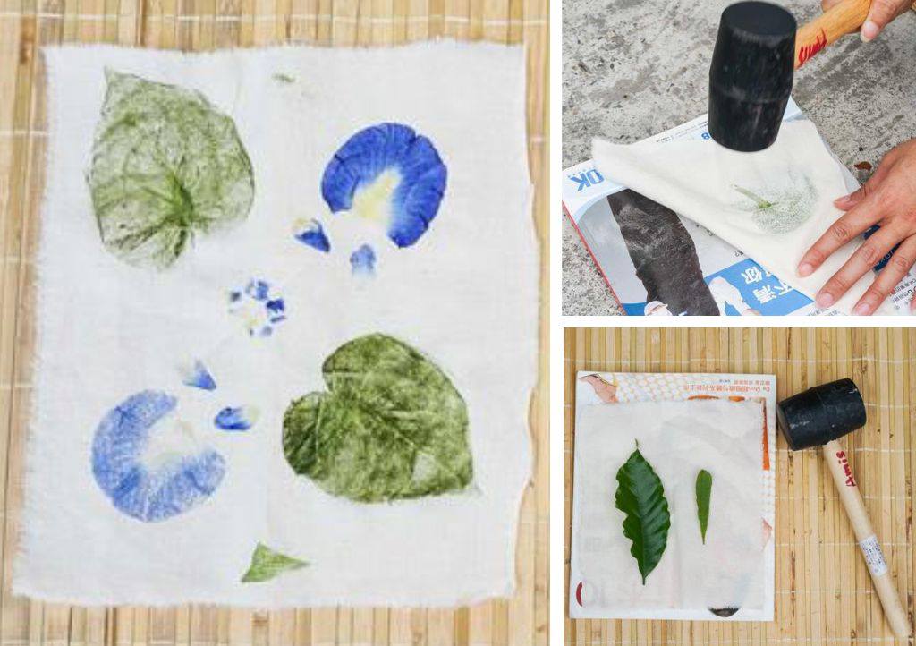 葉拓是一個適合親子、老少皆宜的簡單活動。阿美族是擅於在地取菜的名族,就連活動也是(笑),大家可以自行在院子隨意地摘取葉子,任意擺放後用木槌敲打,把葉子的汁液敲出,而畫布上留下葉脈條狀的紋路,無疑是最美的自然色了。