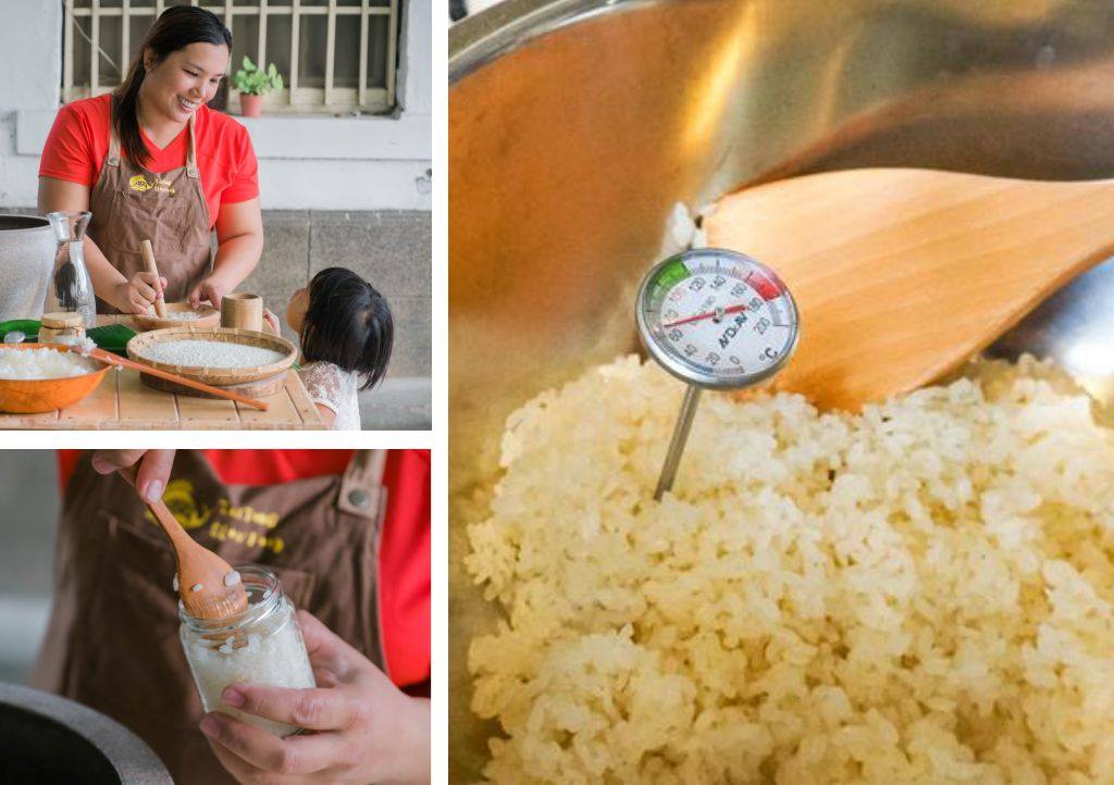 而到了甜酒釀開始要製作時,將蒸熟的圓糯米取出,放入白麴,加入水,攪拌均勻後稍靜置,即可裝入玻璃罐,再綁上敲拓布裝飾,帶回家常溫放置3天(冬天5天)就有香甜可口的酒釀可以吃了。