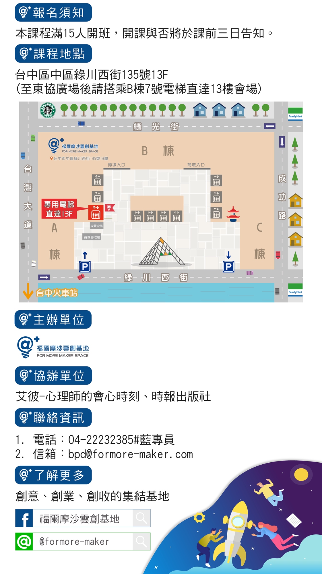 至東協廣場後,請搭乘7號電梯前往13樓課程教室。