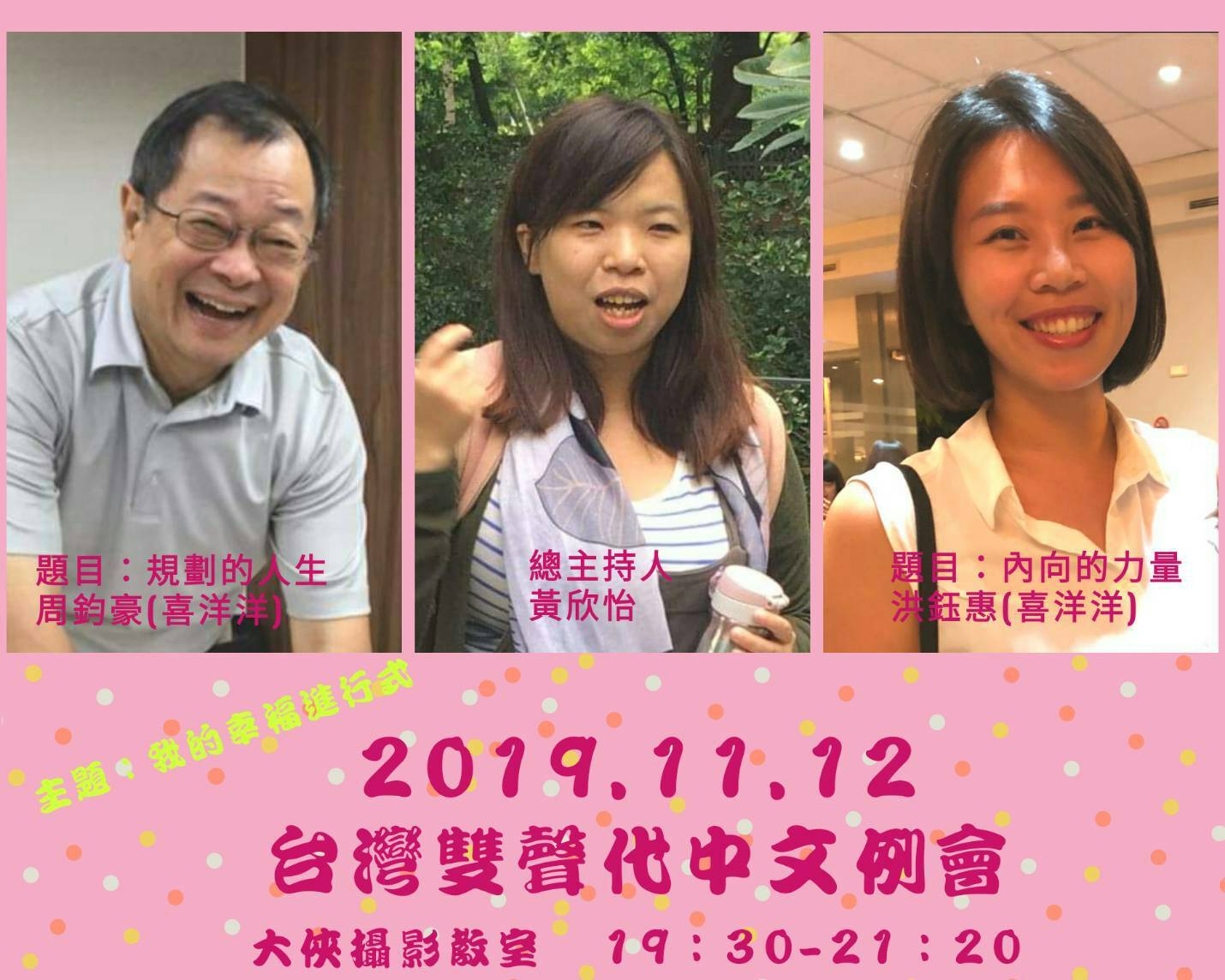 台灣雙聲代演講會邀請您參加於11/12舉辦中文會議,會議主題:我的幸福進行式。精彩活動: