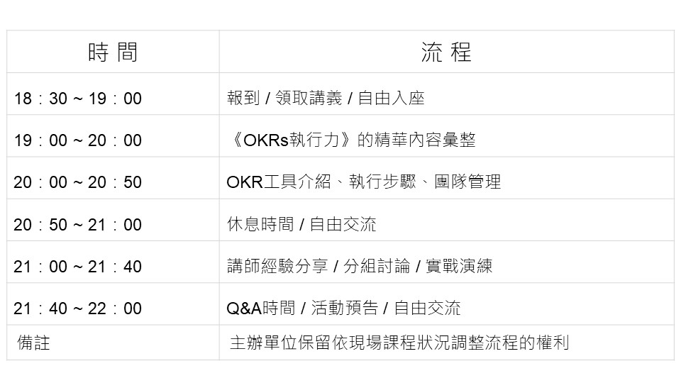 本期主題讀書會,以《OKRs執行力【華人實踐版】》為基底,由創識智庫執行長陳政廷,教您掌握OKR這套工具的精髓和步驟,因時制宜地根據業務與管理現狀、實施目的與目標,靈活運用,發展出適合個人成長及團隊管理的OKR方式!