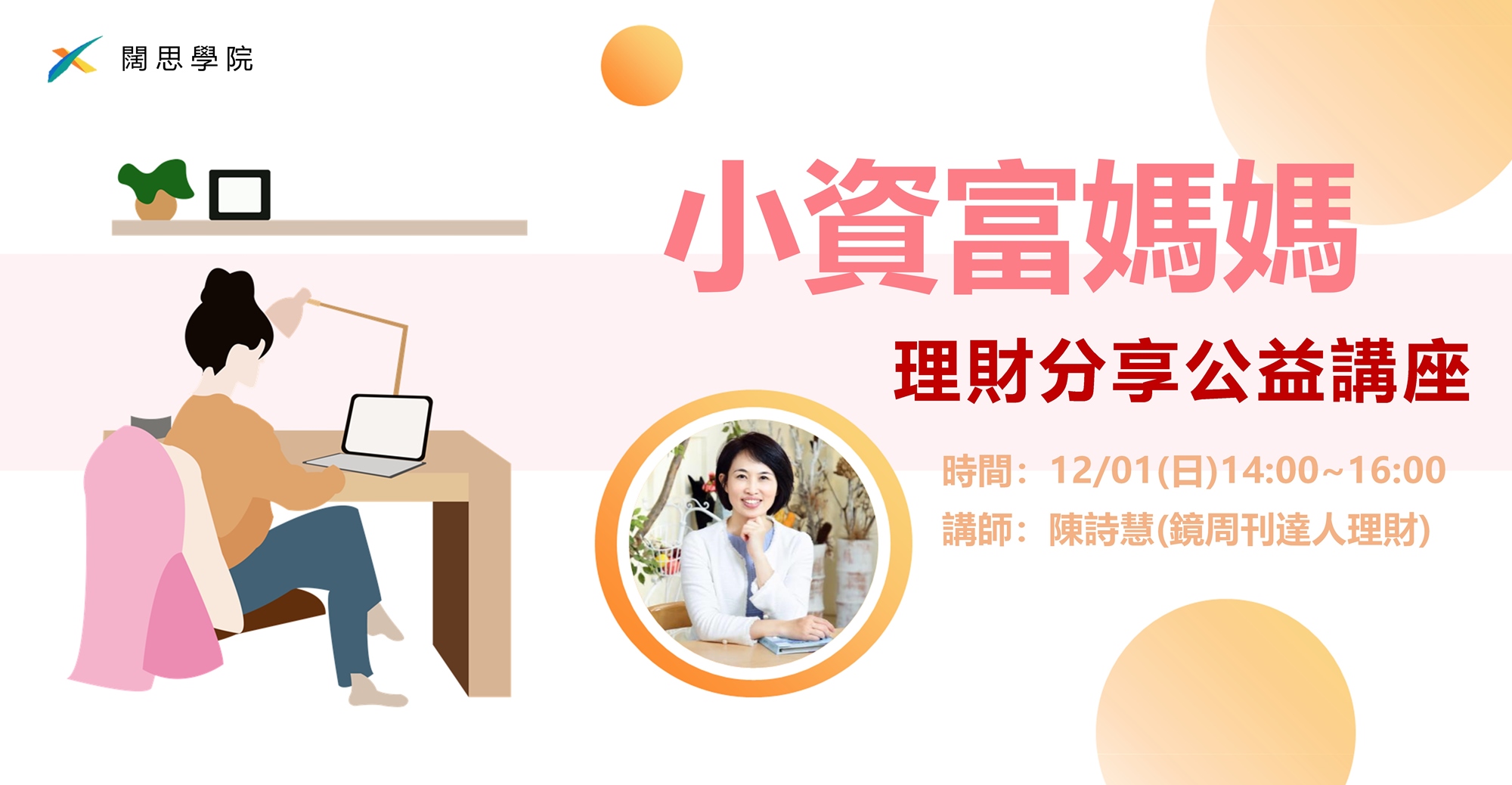 本次公益理財講座,特別邀請詩慧媽媽來分享她是如何從一個平凡上班族,成功轉變為專業理財達人?她人生中最重要的理財觀念是甚麼?