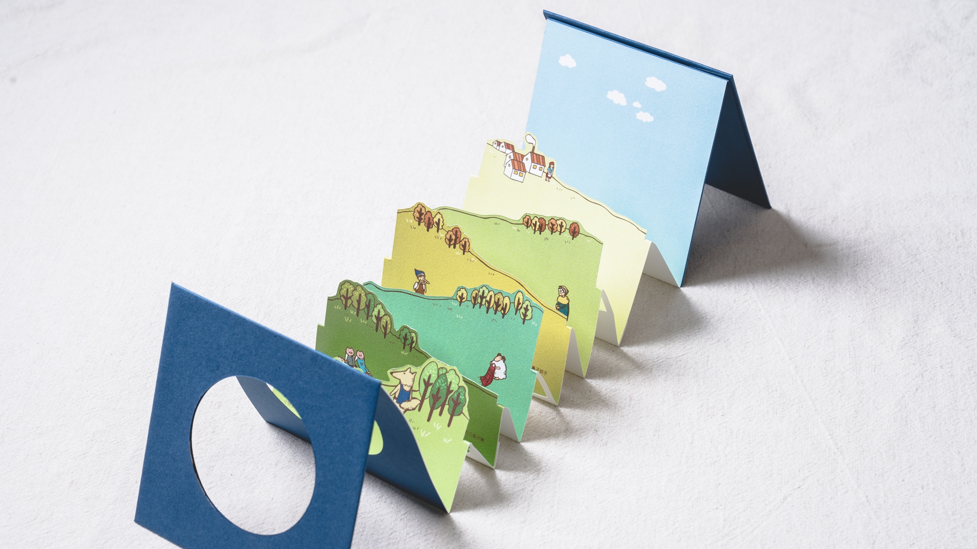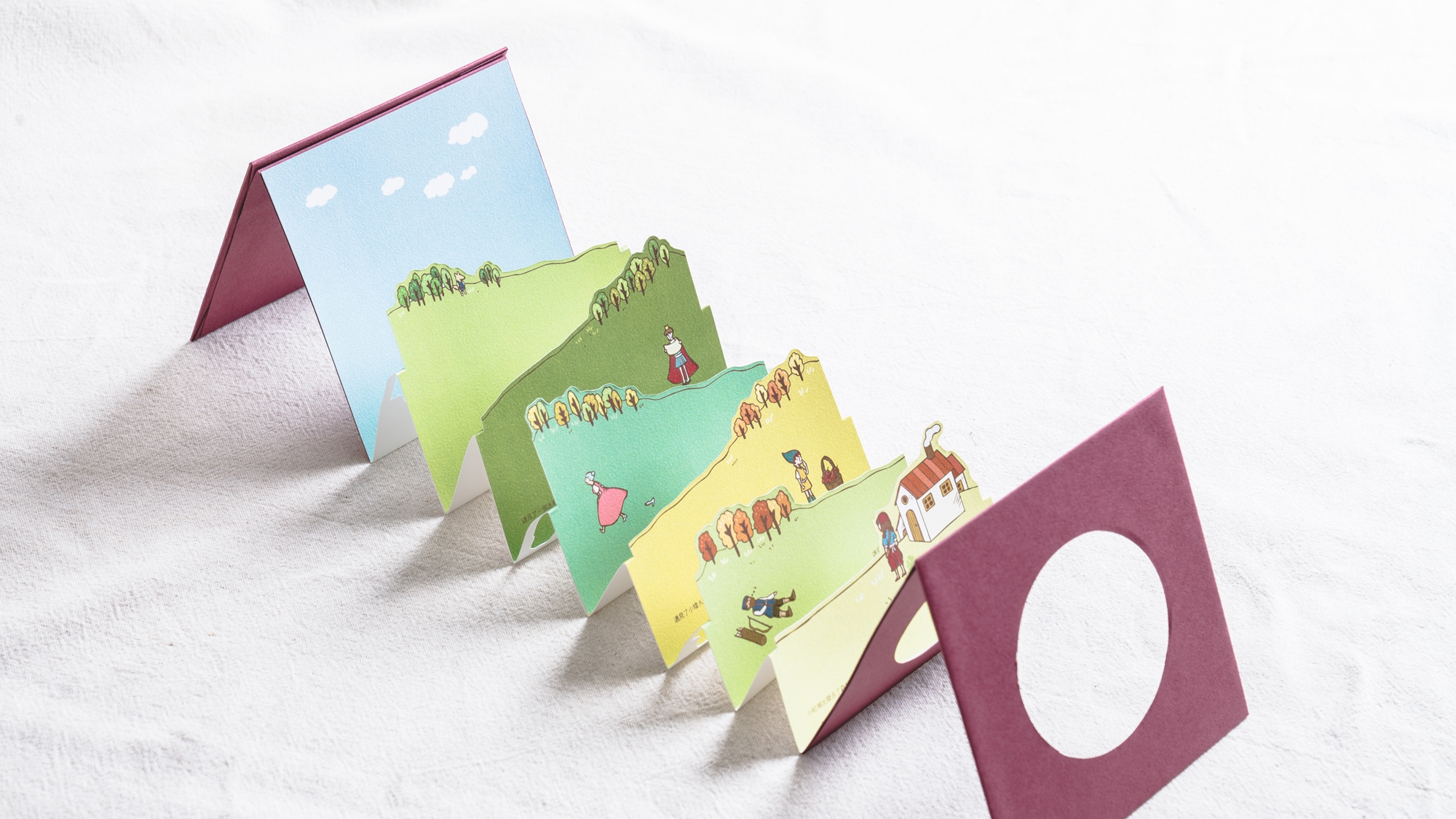 立體書結構巧妙的透過主題「翻山越嶺」的概念,結合經文摺頁書與古典立體隧道書層層堆疊的結構,帶領讀者們從正面可以看見兩位主角透過一座座森林對望,從側面也可以感受山巒連綿起伏的樣貌,不管是一頁頁的翻閱或是拉開全覽,都可以一起感受主角們一次次奇幻冒險旅程。
