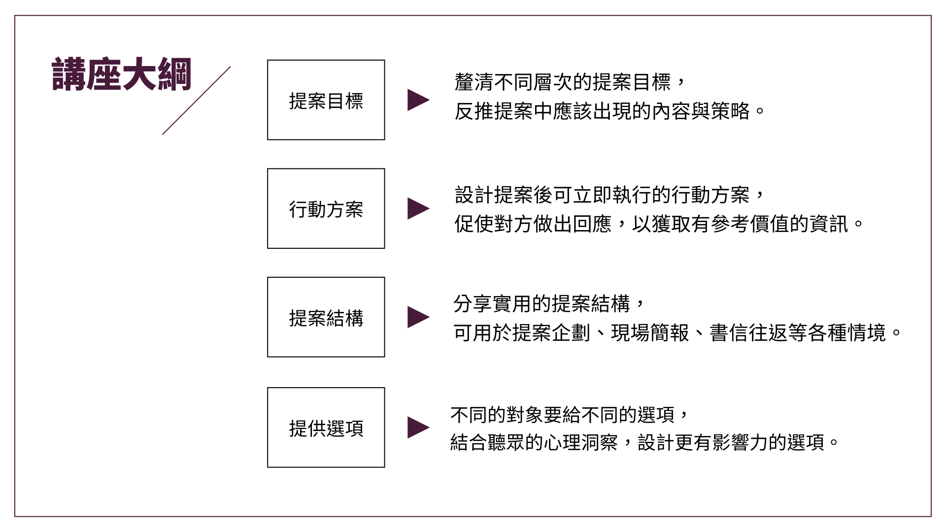 提案是職場人士經常面對的簡報情境,無論是對內向主管匯報、跨部門與同事協作,對外向客戶銷售、向商業夥伴提出合作計畫等。提案在某些場合甚至就代表了企業品牌或個人的本職學能。講師將提案收斂成「目標」、「方案」、「架構」、「選項」四個面向,分享基於實務的提案技巧,增加提案的影響力,以及對聽眾的認可率。
