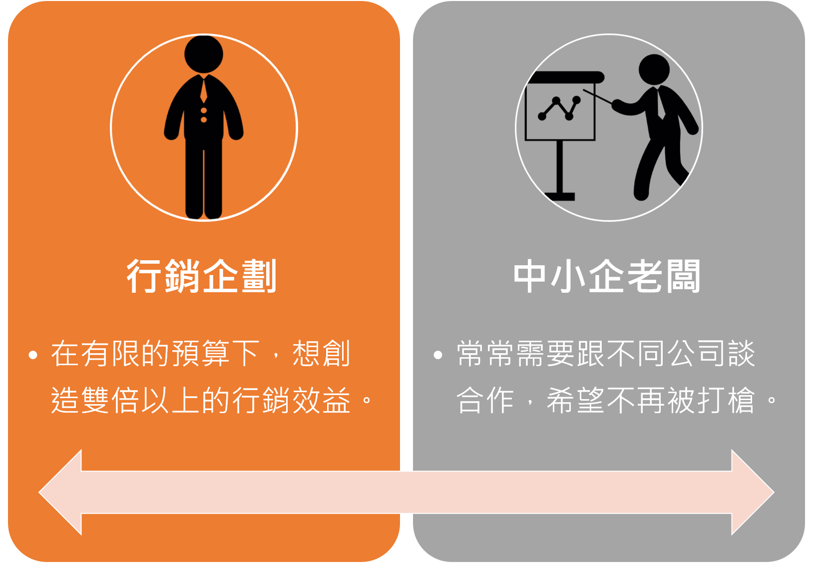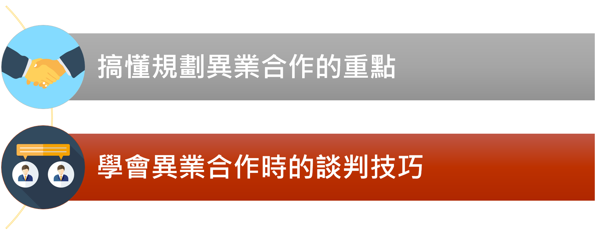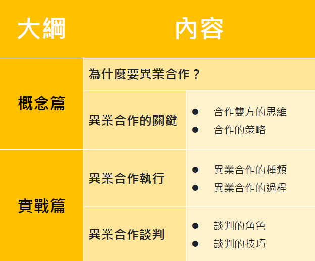 本次課程,邀請到創宇數位的執行長溫慕垚老師,前來講授異業合作的行銷操作及談判技巧,你將能學會如何透過分享資源,取得低成本卻效益加乘的策略思維,並透過有效的談判達到強強聯合的效果。