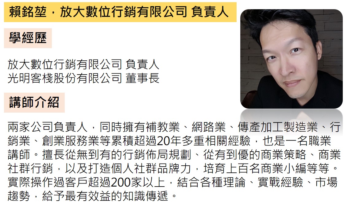 本次講座,邀請到「放大數位行銷」有限公司的負責人賴銘堃(阿咪老師),以20多年來的商業思維且培育上百位商業小編與超過200家客戶的經驗,前來分享如何透過省時省力的行銷工具,在最短的時間內提升行銷能力,讓你學會用社群讓消費者產生印象的實際做法,不僅增加與顧客黏著度,更創造未來每筆業績成交量。
