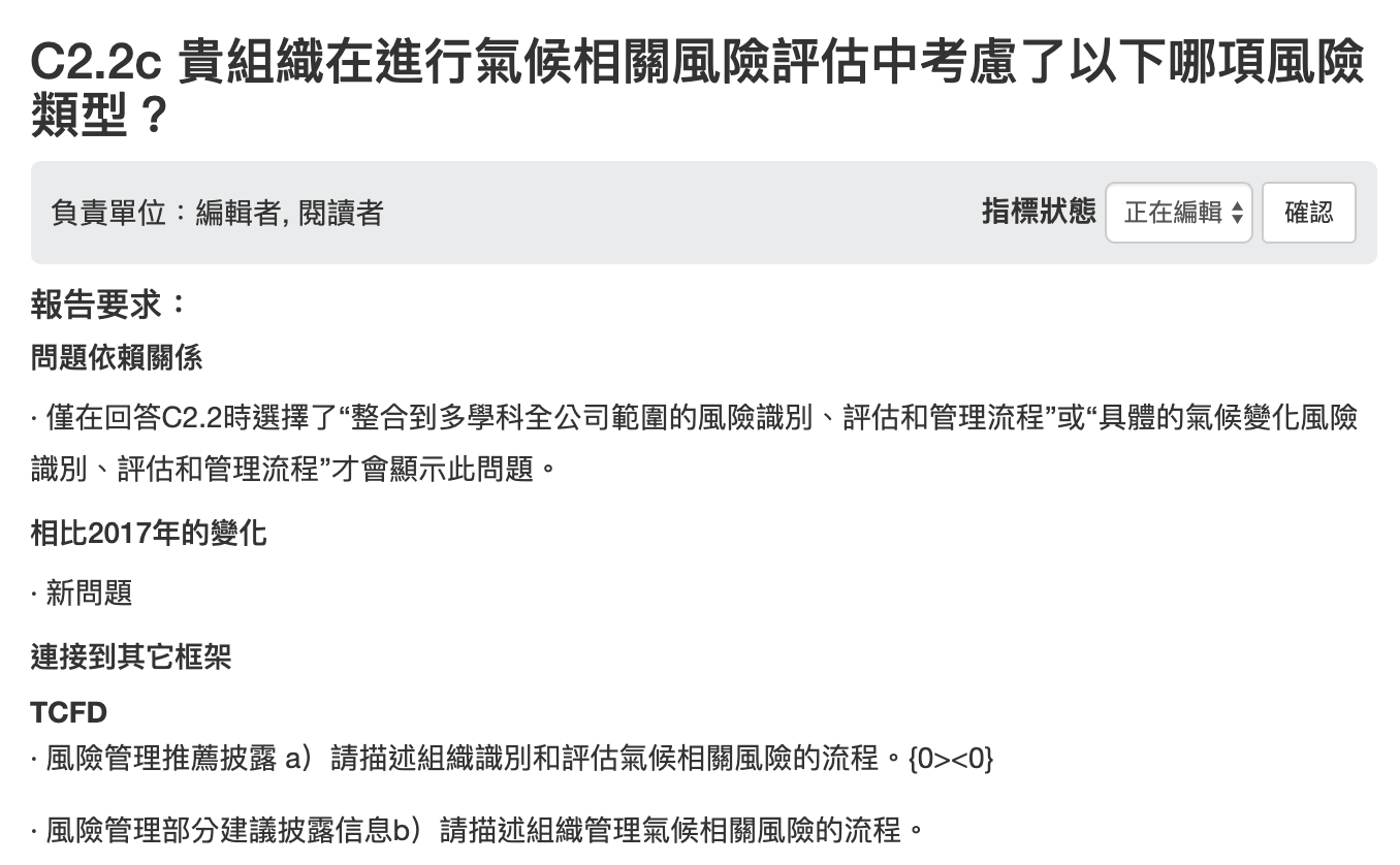 系統預設的報告框架,除了GRI Standards之外,也新增SDGs和CDP的報告框架,方便CSR從業人員可以更快速建立各種永續發展相關的報告。同時,也會自動帶入各指標的制式表單內容,更有效率的蒐集與盤點相關資料。