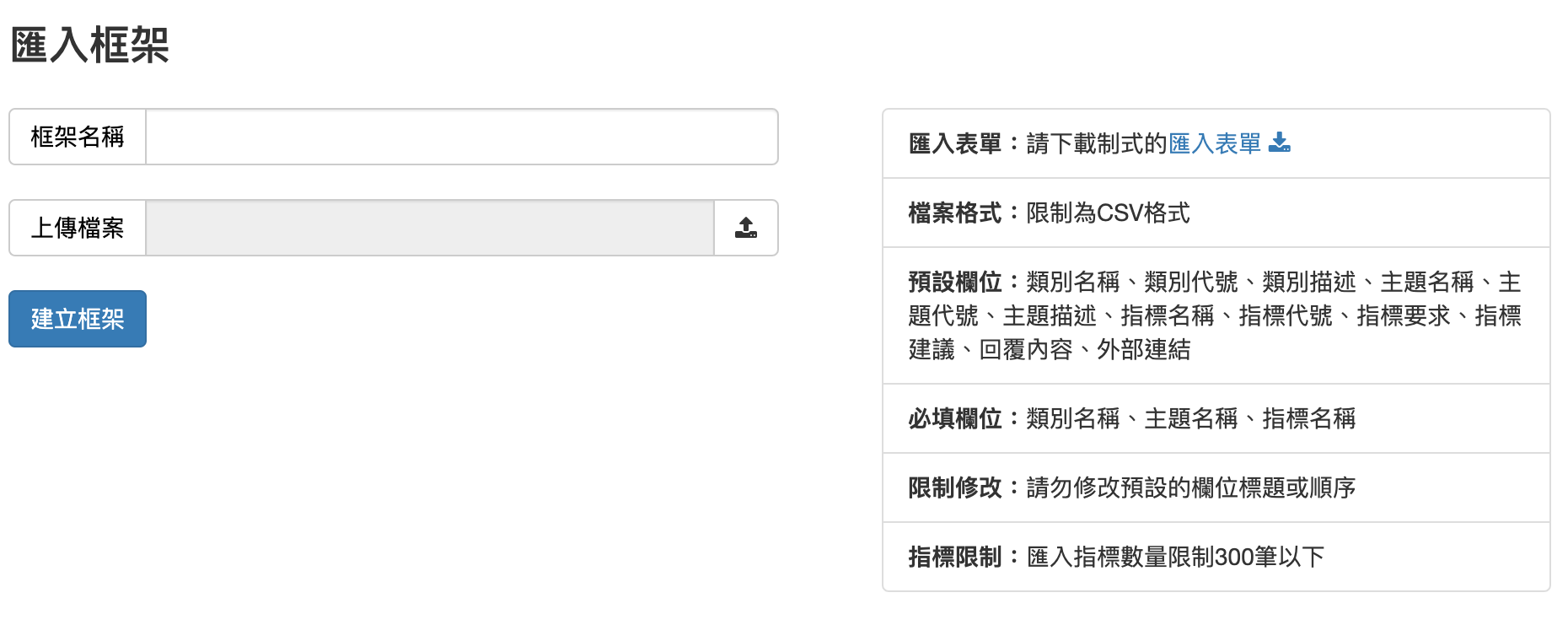 如果公司希望建立客製化的報告框架,可以直接下載系統提供的制式匯入表單(csv),用Excel編輯各項指標項目後,直接上傳至系統,即可完成匯入客製化的報告框架!