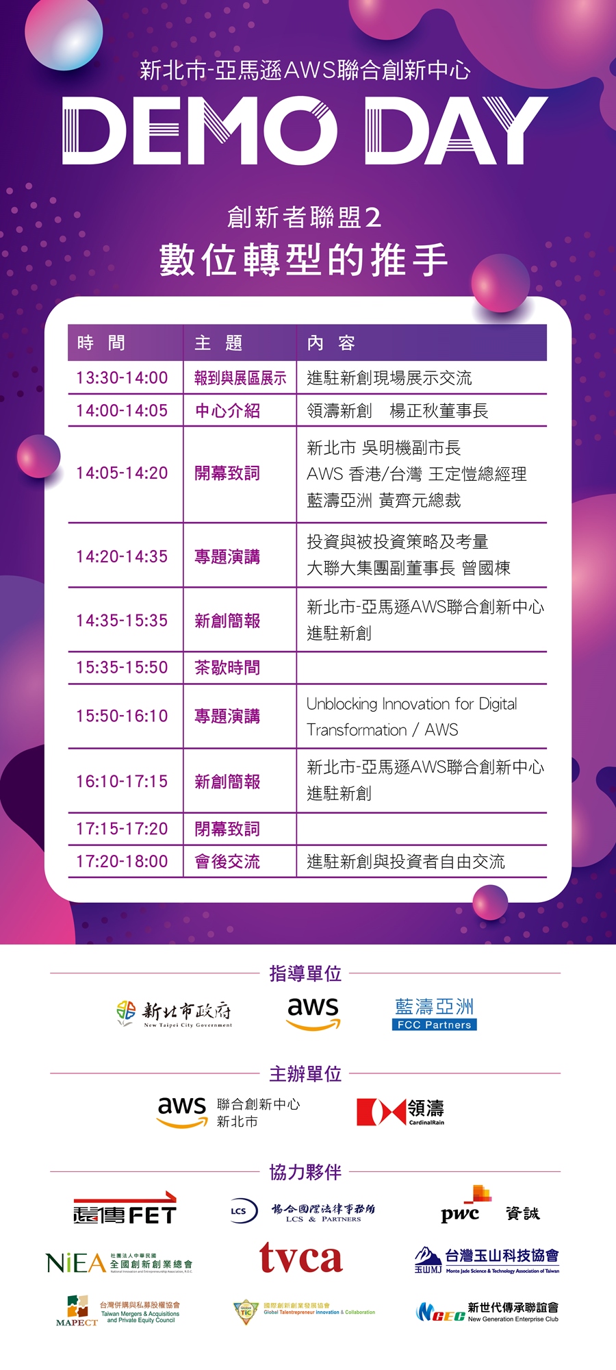 很抱歉本次 Demo Day 因報名踴躍,已額滿截止受理報名,敬請見諒,感謝您的支持。如欲得知更多活動資訊,歡迎關注中心官方臉書專頁 https://www.facebook.com/NTPCAWSJIC