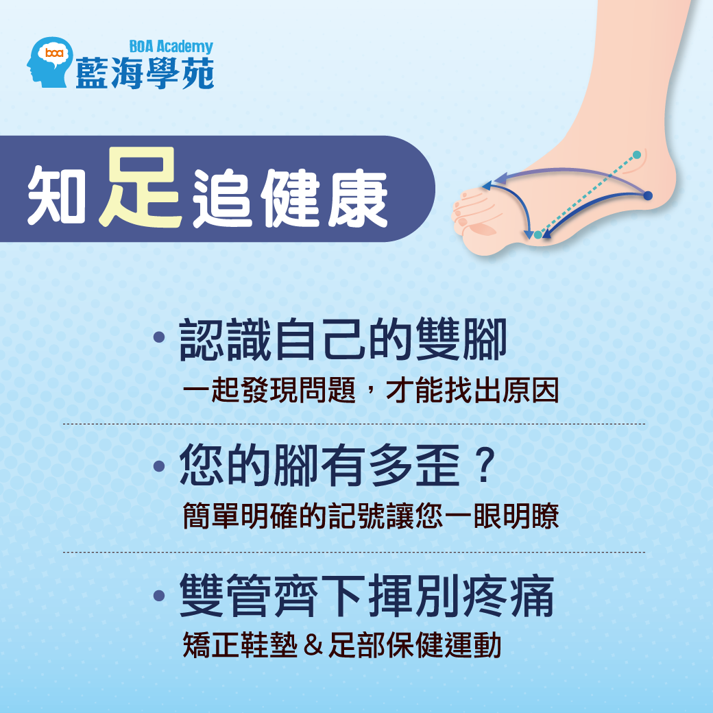 本講座以深入淺出的方式帶著學員逐步了解自己的雙腳,透由實用易上手的篩檢流程幫助民眾找到造成不適的原因,並分享選鞋原則、矯正鞋墊介入與足部運動等資訊,針對所發現的問題提供解決方案。