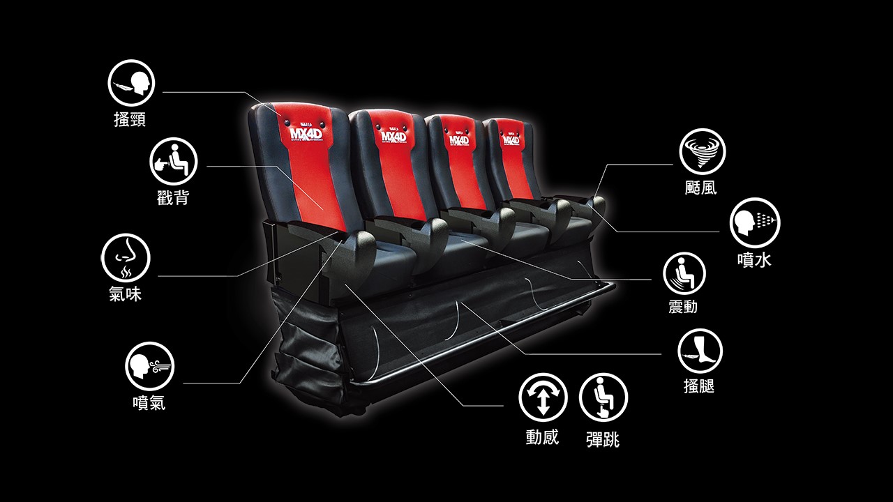 MediaMation MX4D動感影廳為電影場景提供座椅搖晃、左右移動、振動和風雪、熱氣、噴霧、香氣、閃電、泡泡等12種特效,讓觀眾能在觀影中身歷其境,體驗與眾不同的立體觀影感受。