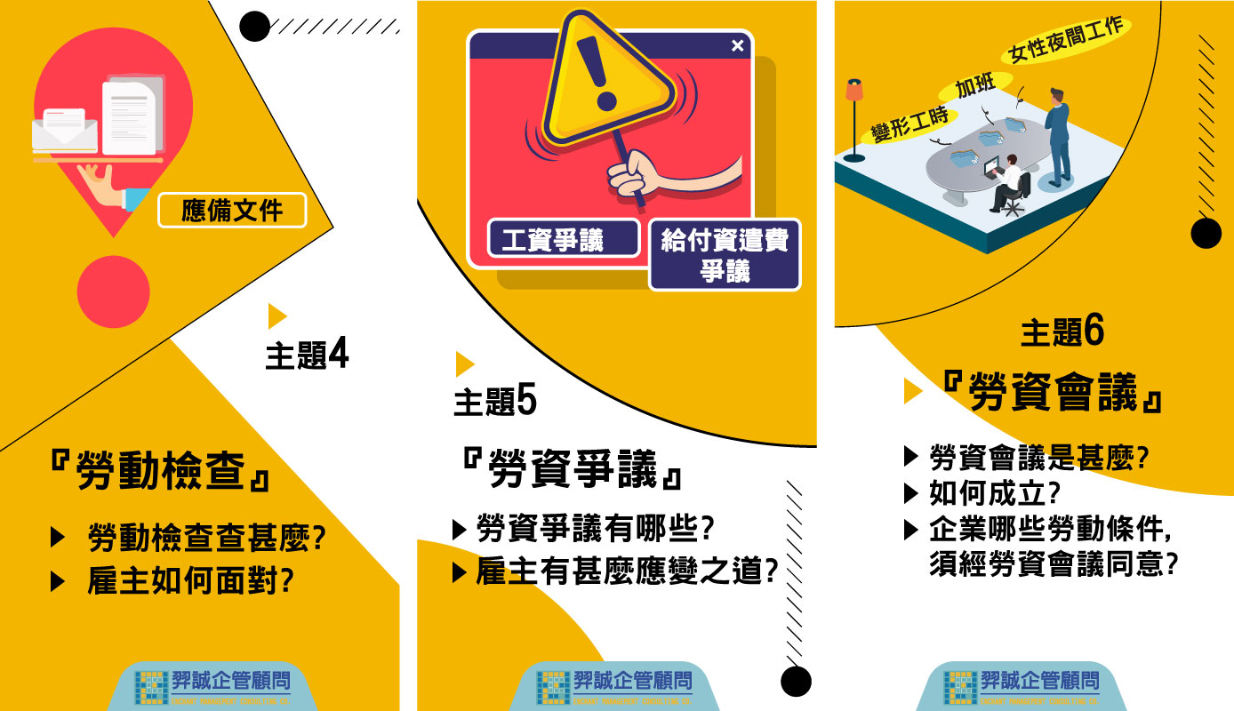 本課程將從公司常面臨的勞動檢查及勞資爭議分析,提供企業主事前預防之因應措施,如勞資會議成立及開會流程、勞動檢查須具備文件等,以避免高額的行政罰鍰。