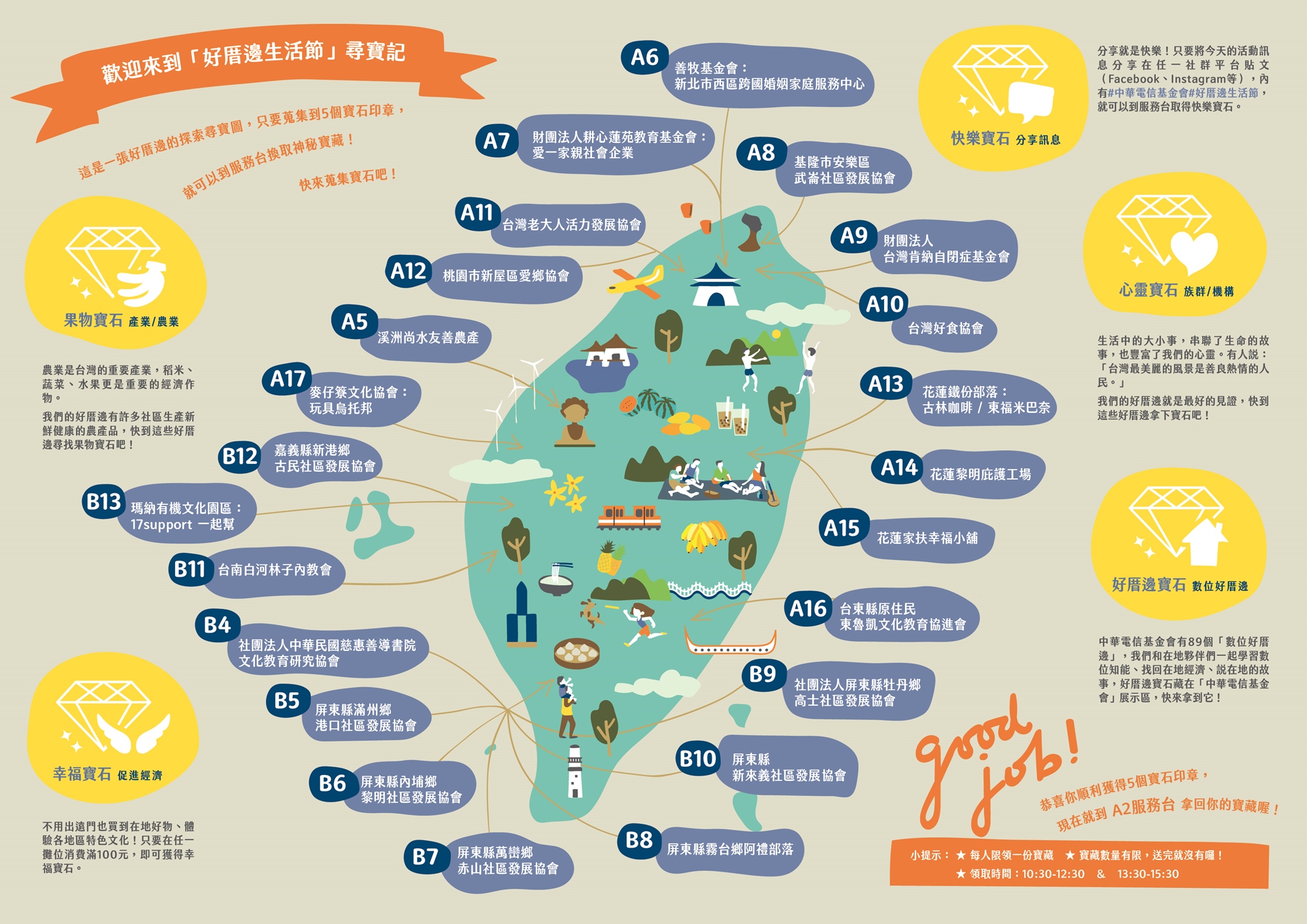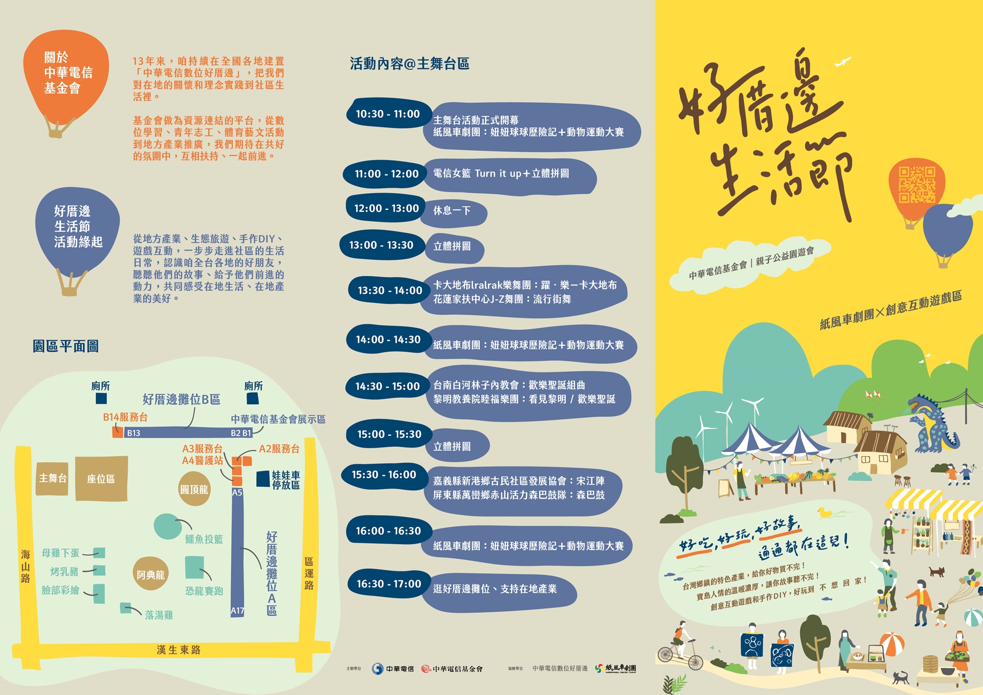 中華電信基金會與您一起做公益、共同支持在地產業,只要在園遊會完成「好厝邊生活節」尋寶闖關活動,就有機會獲得神秘小禮物,數量有限,送完為止!