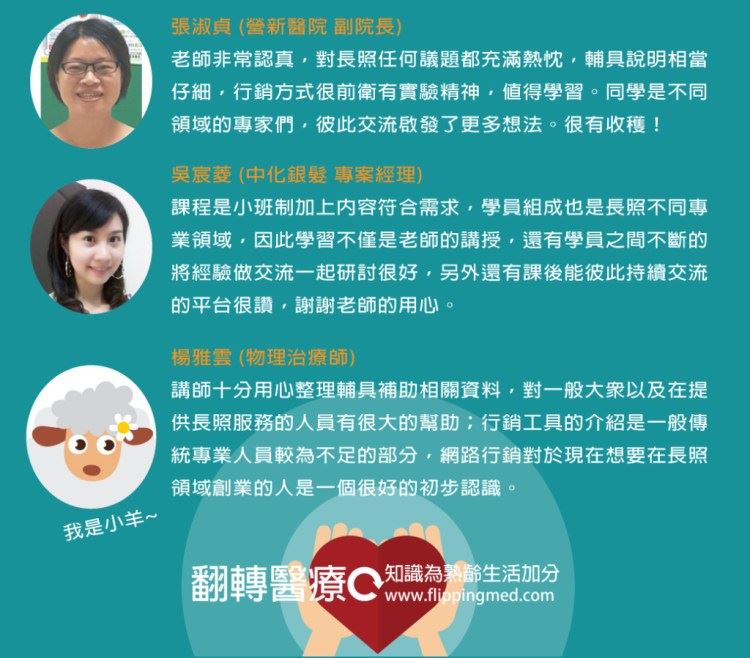 - A:因為我們是教你怎麼進入長照產業,你總不希望上完課後一堆競爭對手。就像加盟主不會要求麥當勞加盟金降到超低,結果每條街兩三家麥當勞。